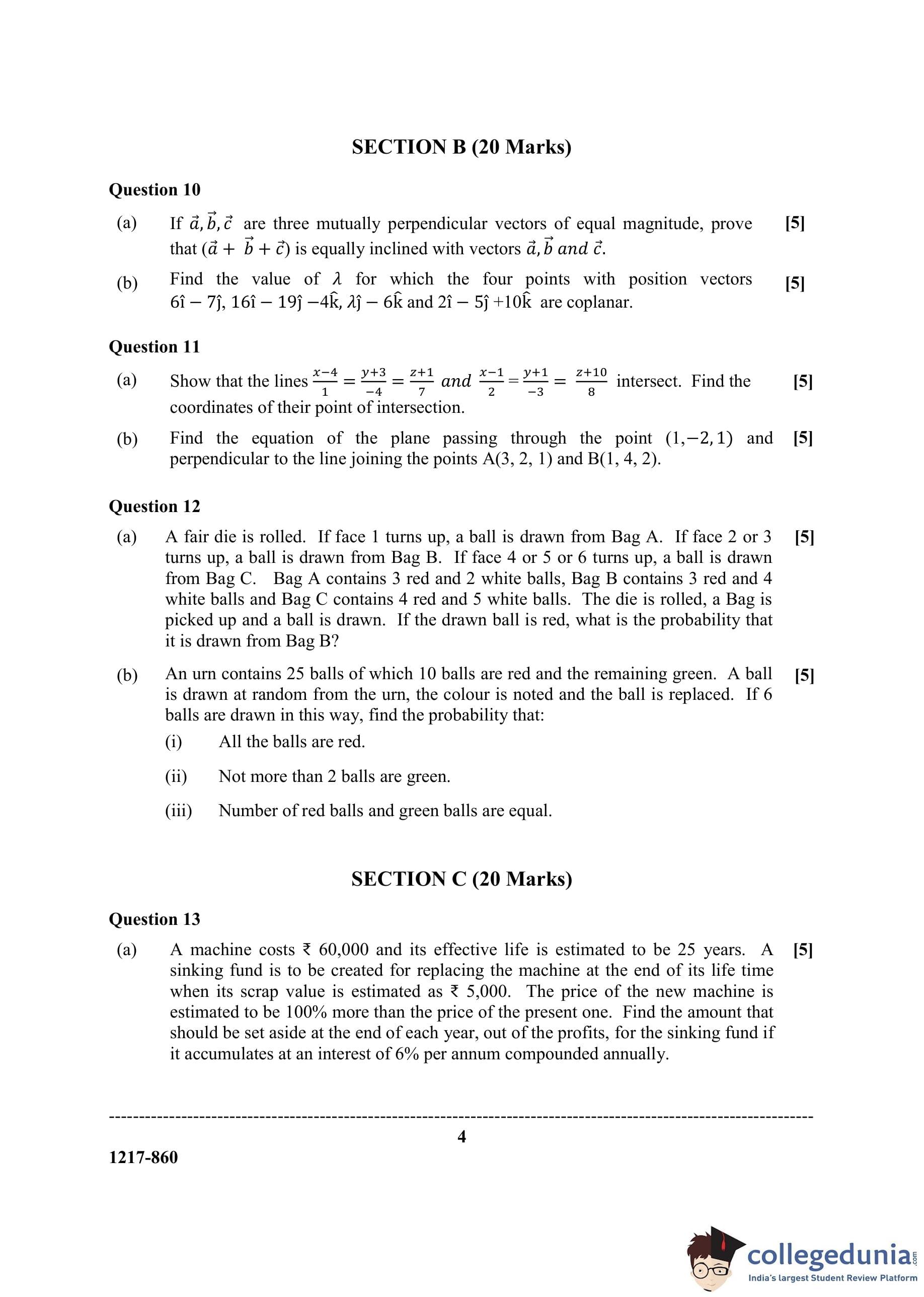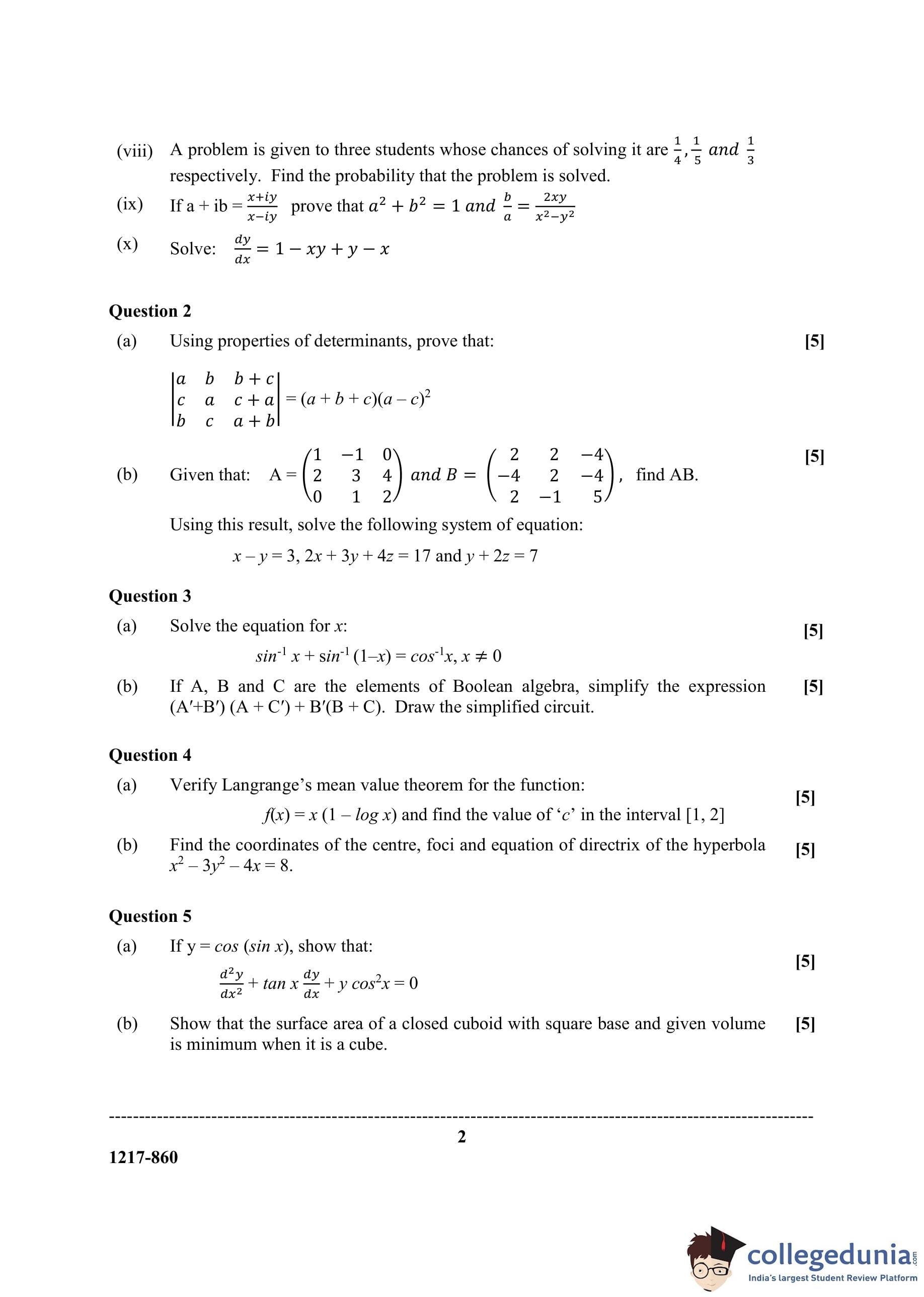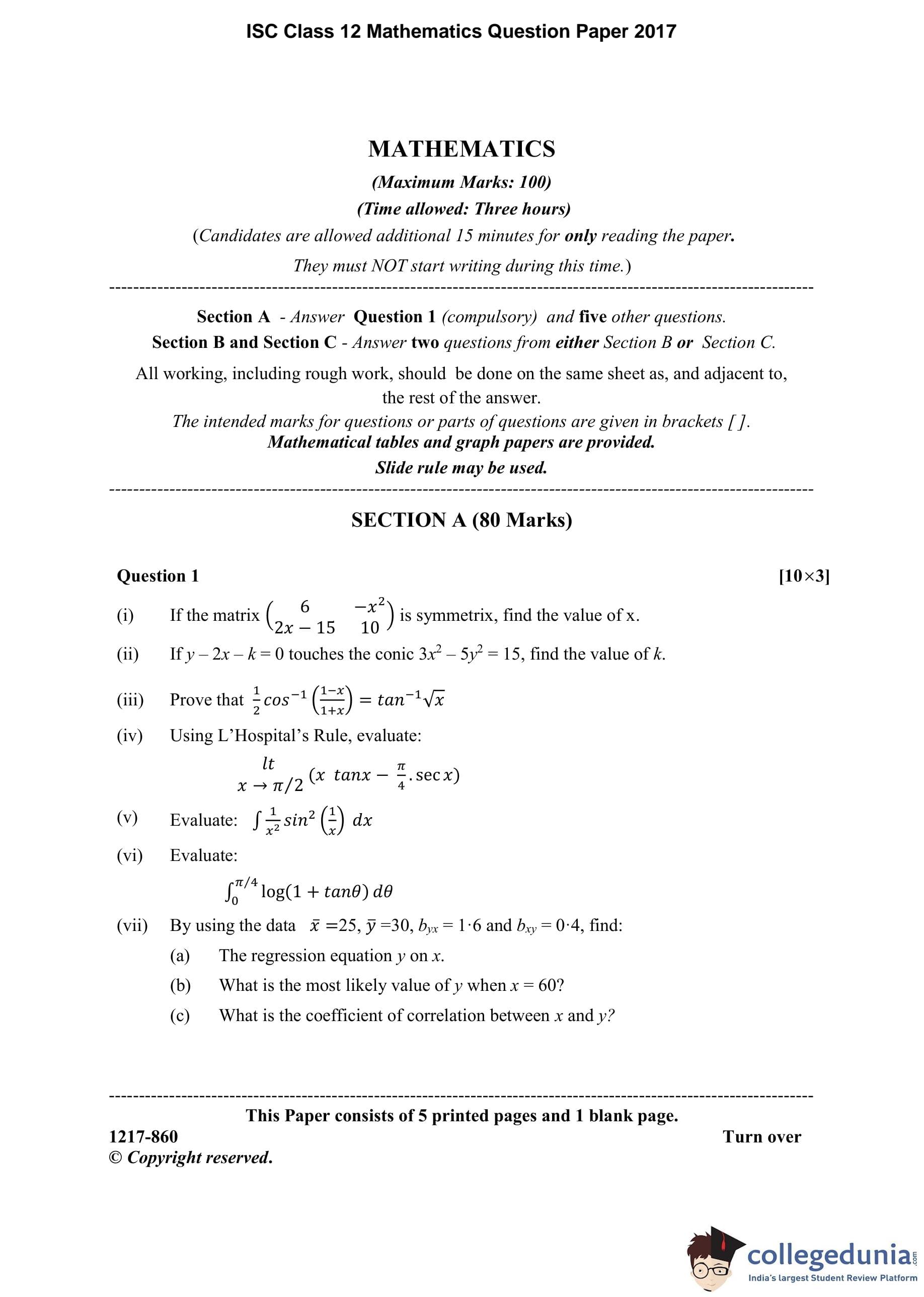 ISC Class 12 Mathematics Question Paper 2017 with Answer Key