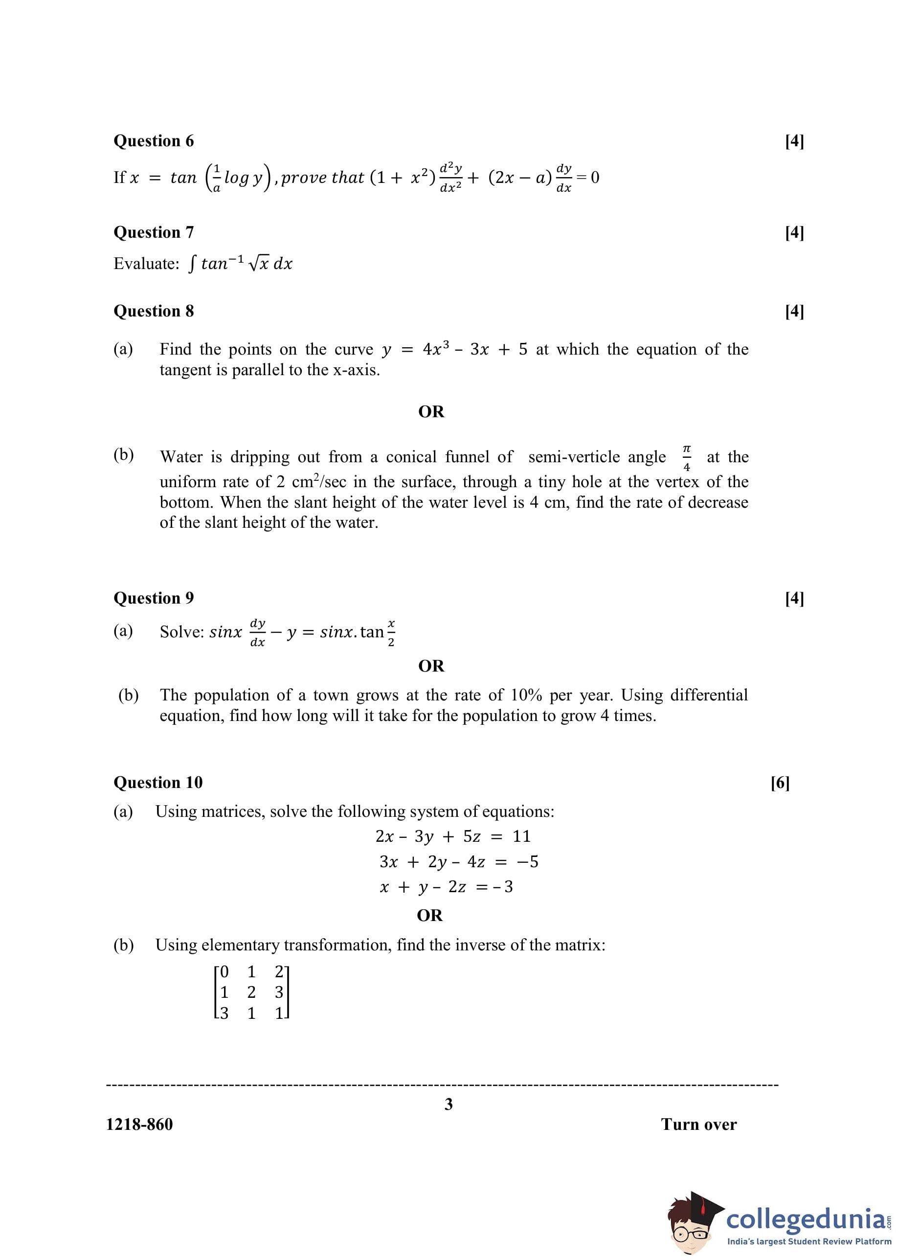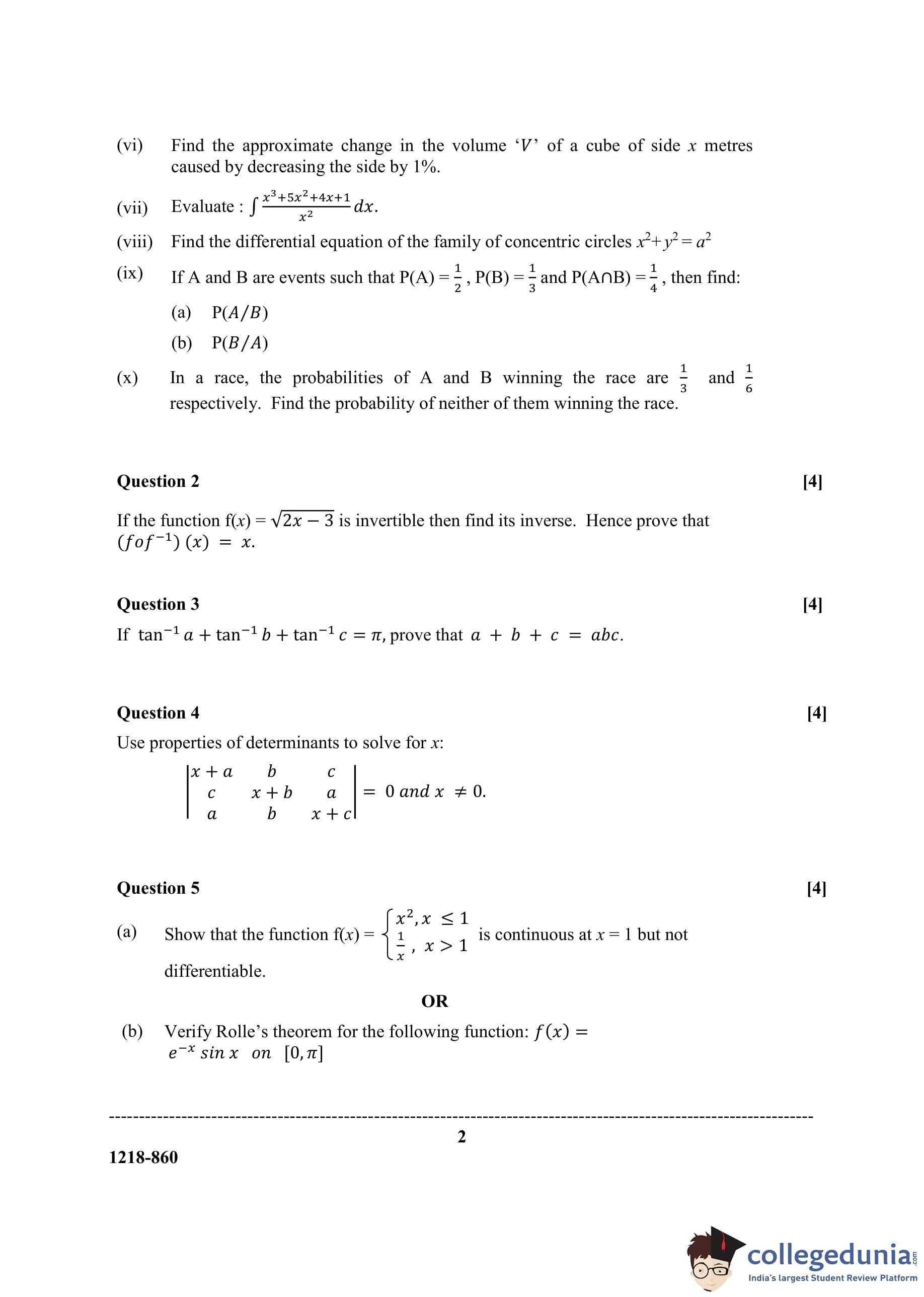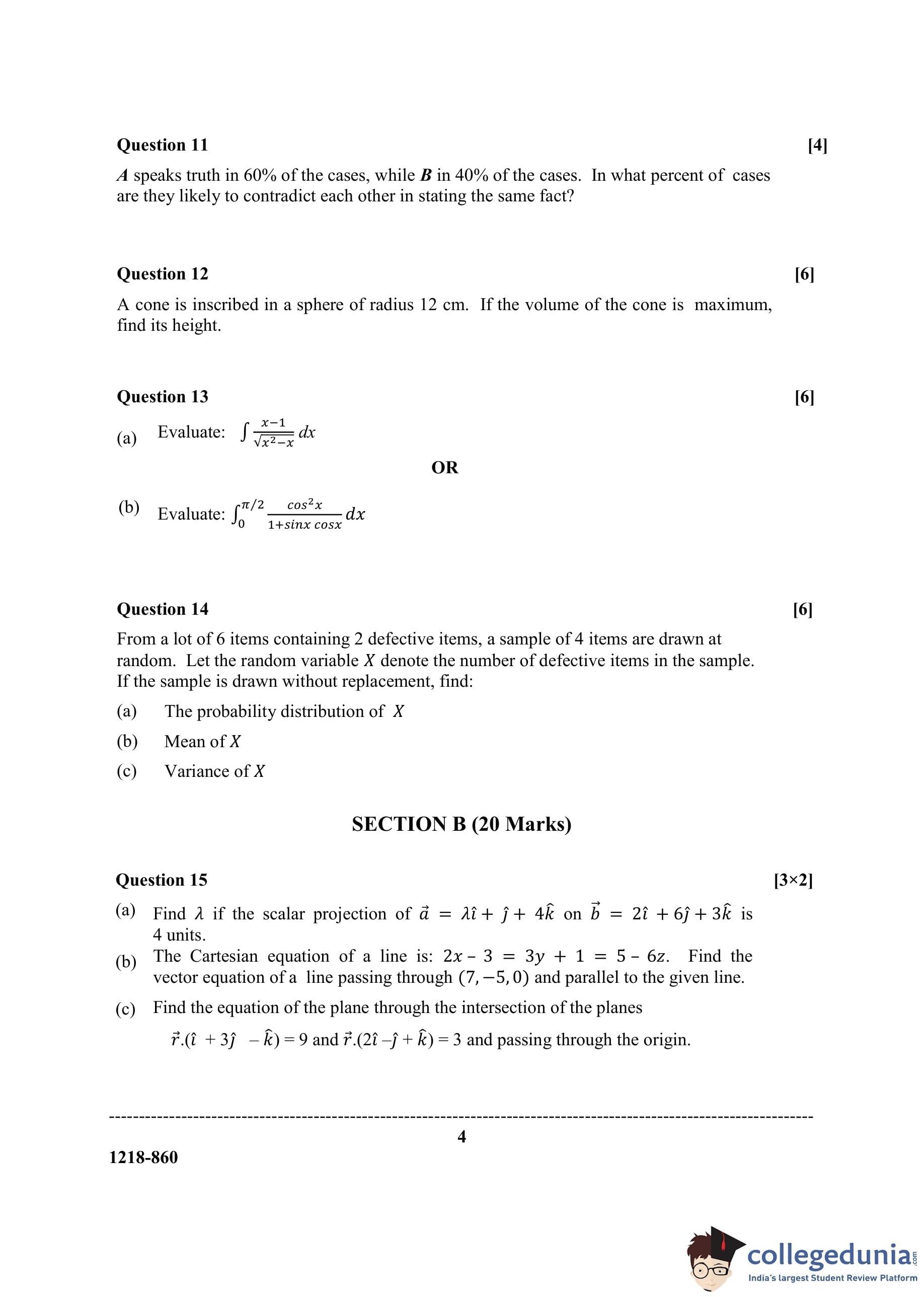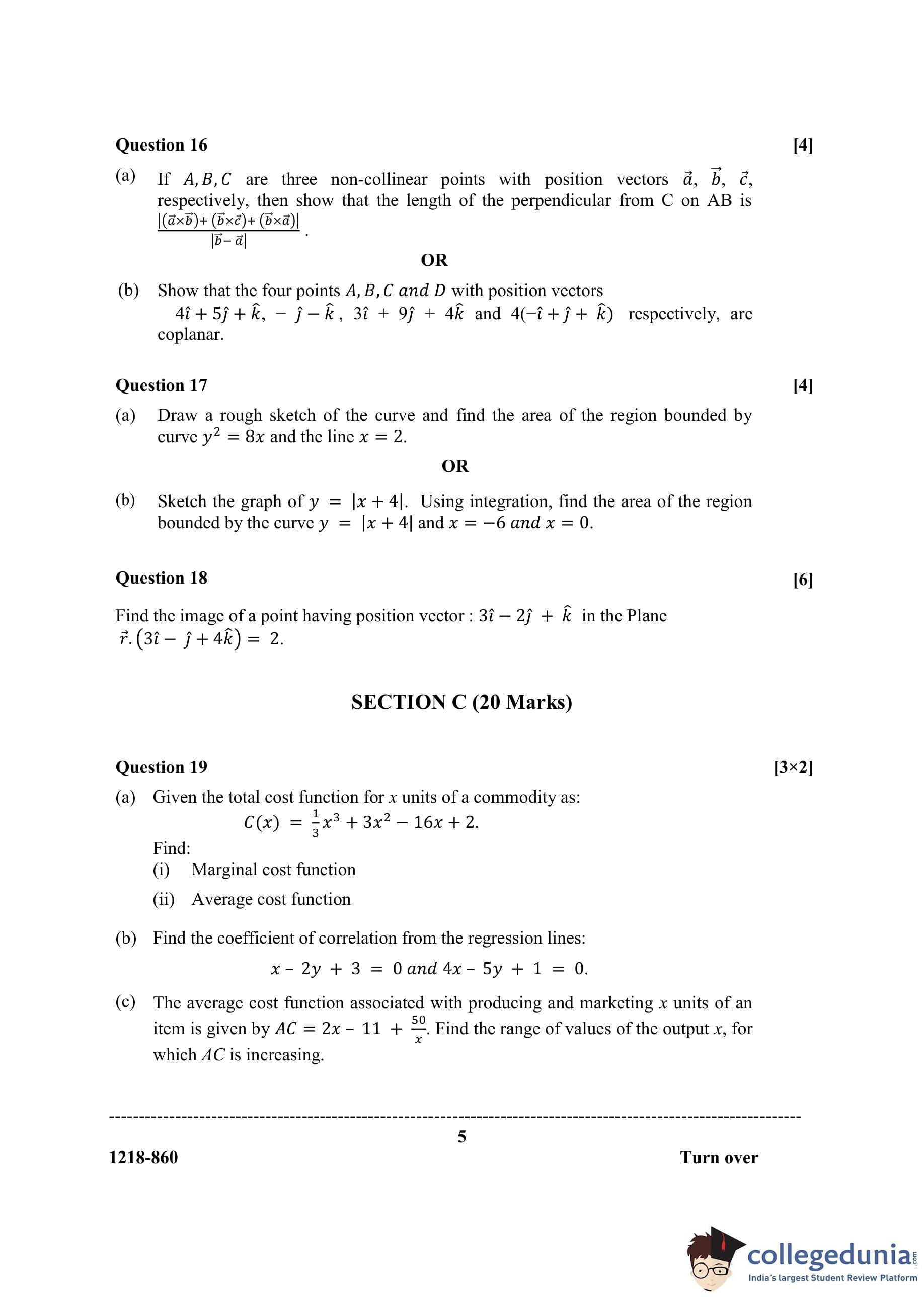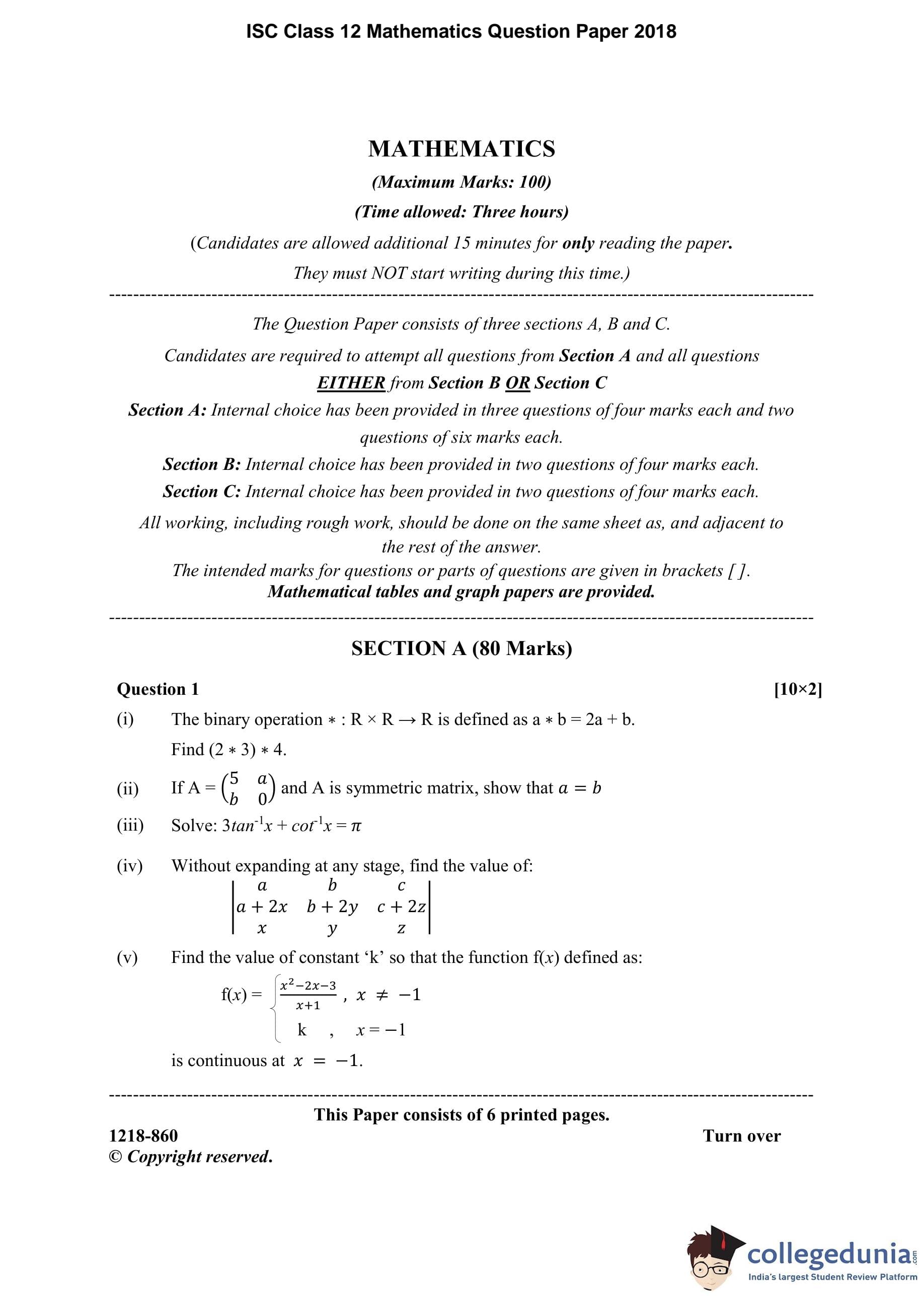 ISC Class 12 Mathematics Question Paper 2018 with Answer Key