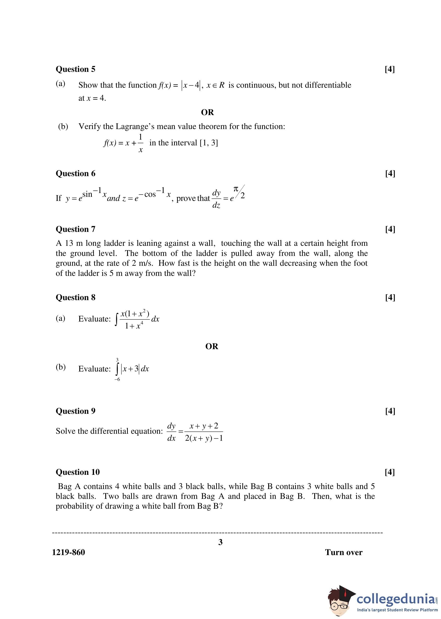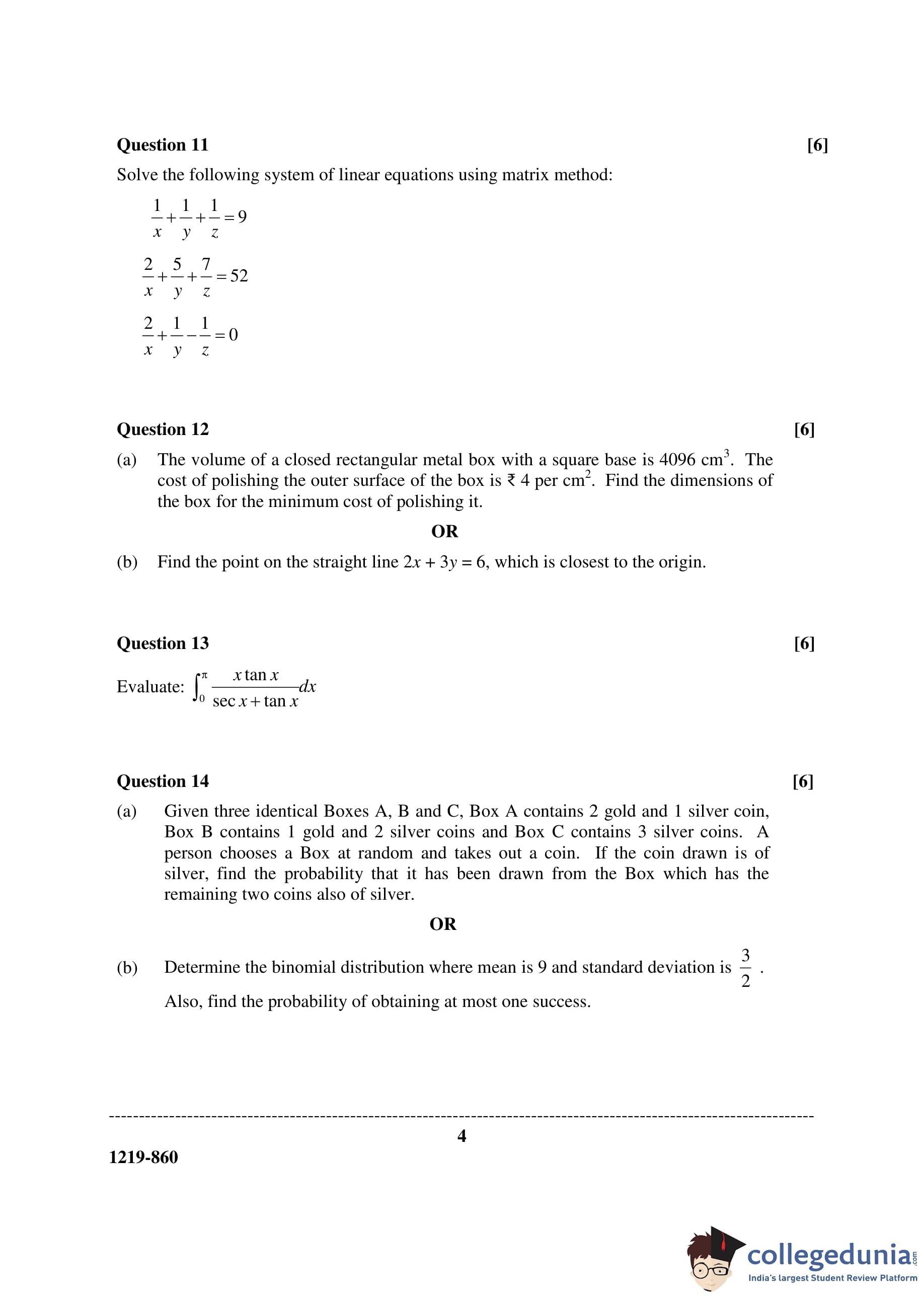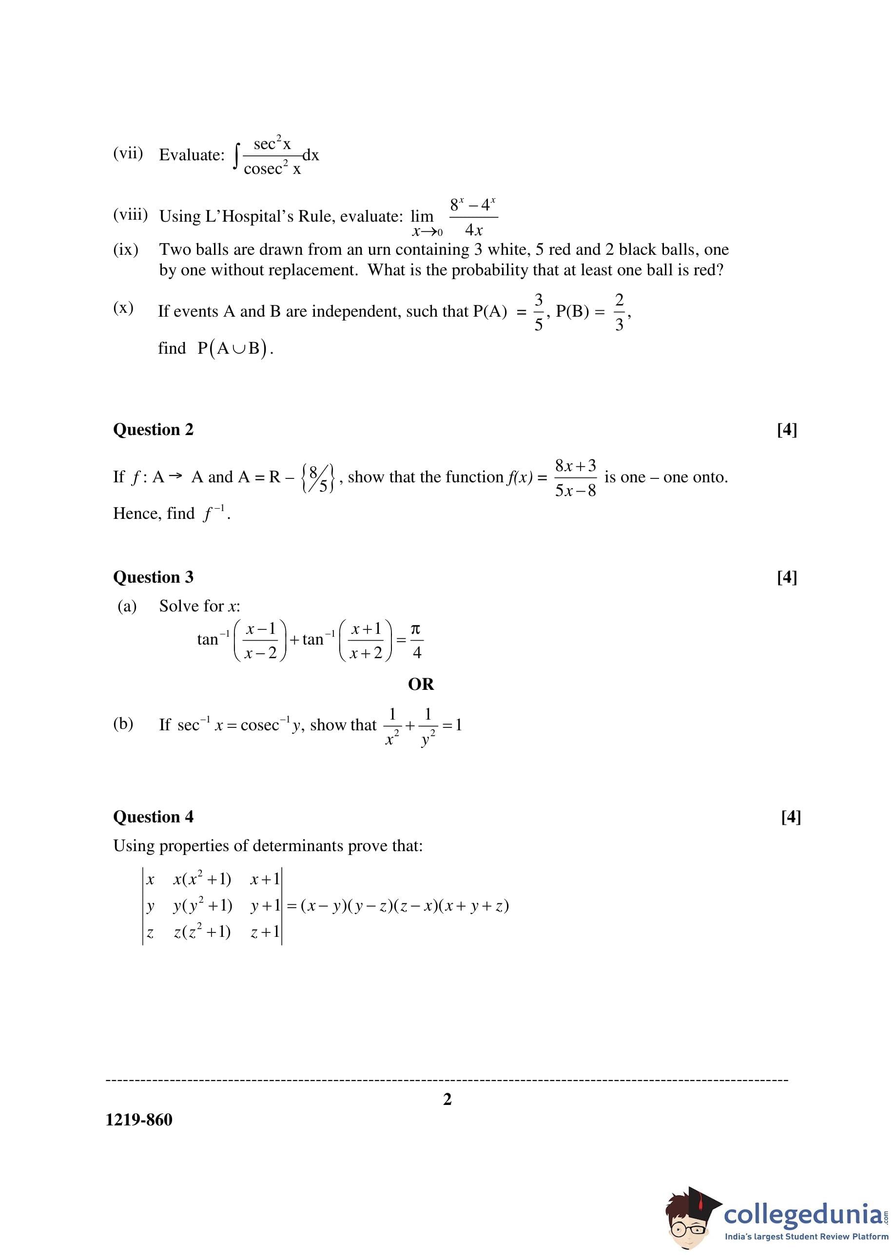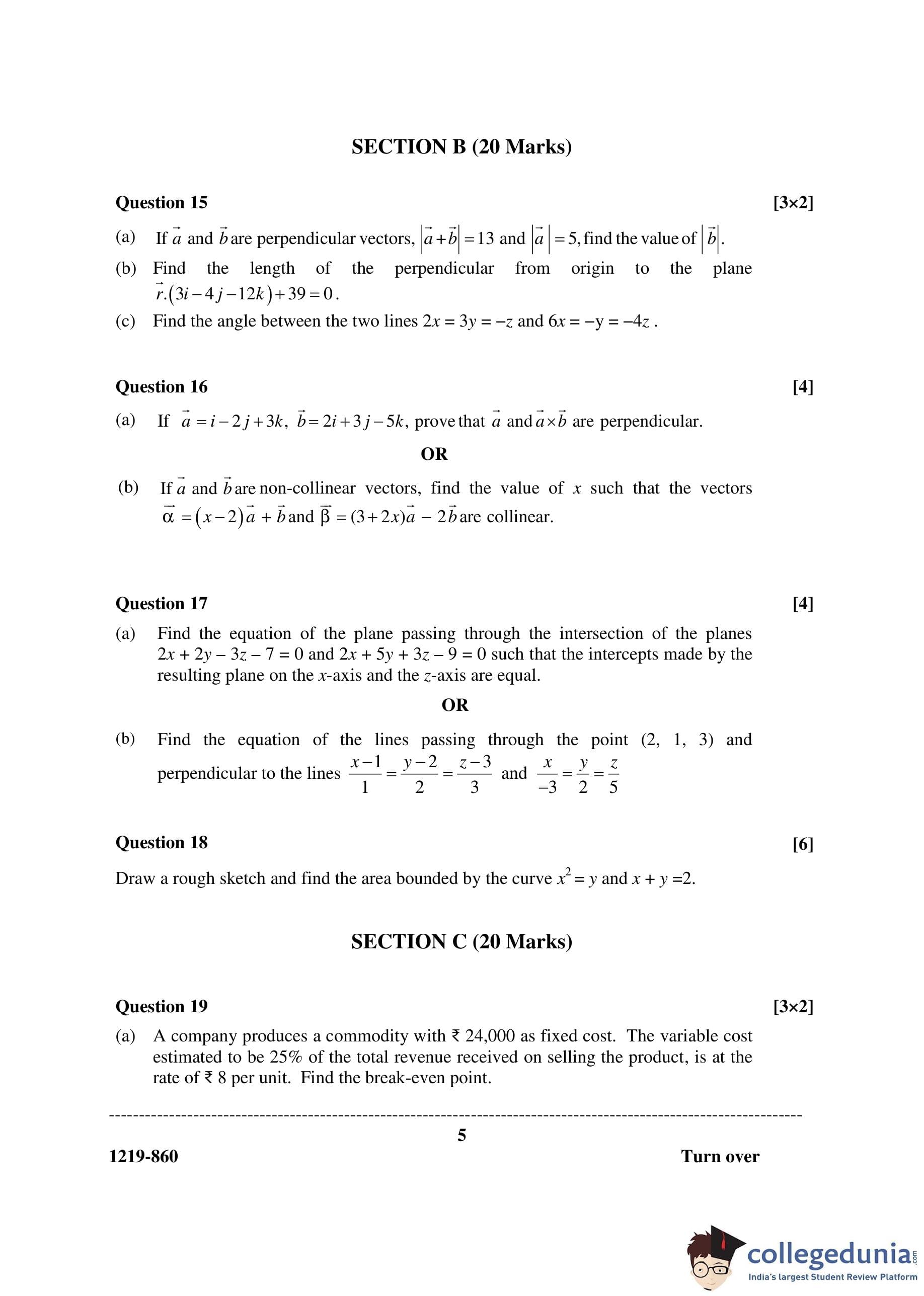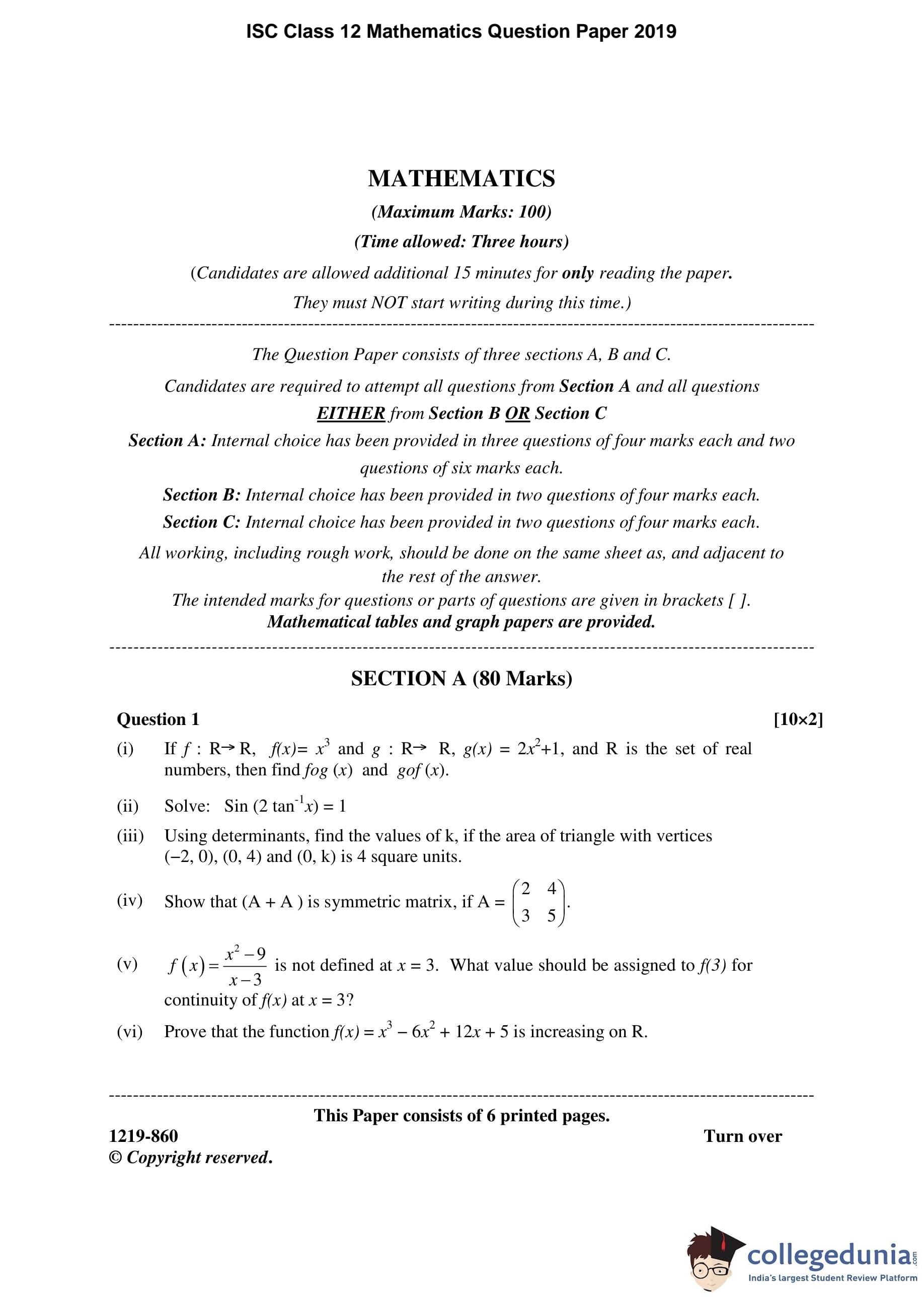 ISC Class 12 Mathematics Question Paper 2019 with Answer Key