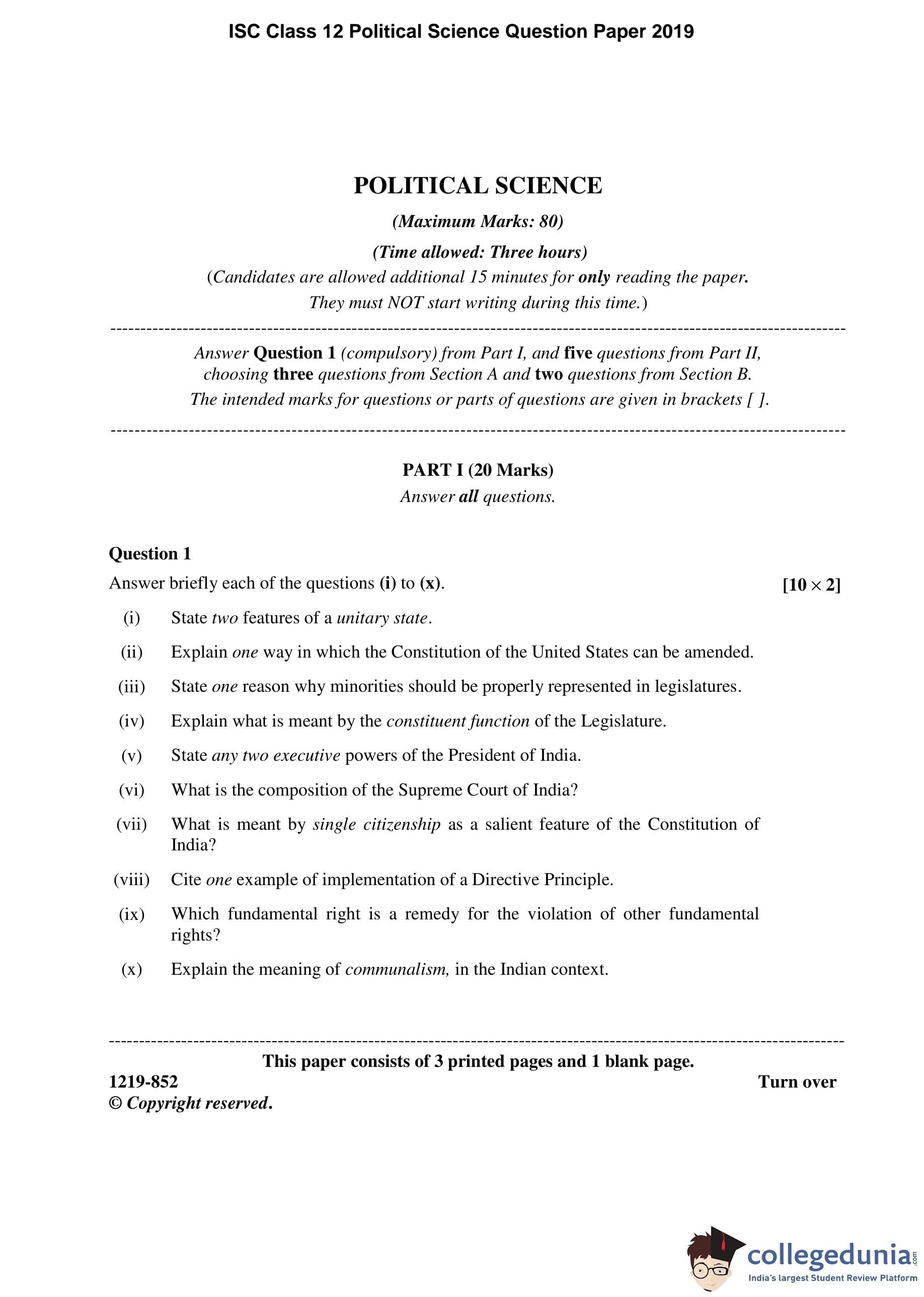 ISC Class 12 Political Science Question Paper 2019 with Answer Key