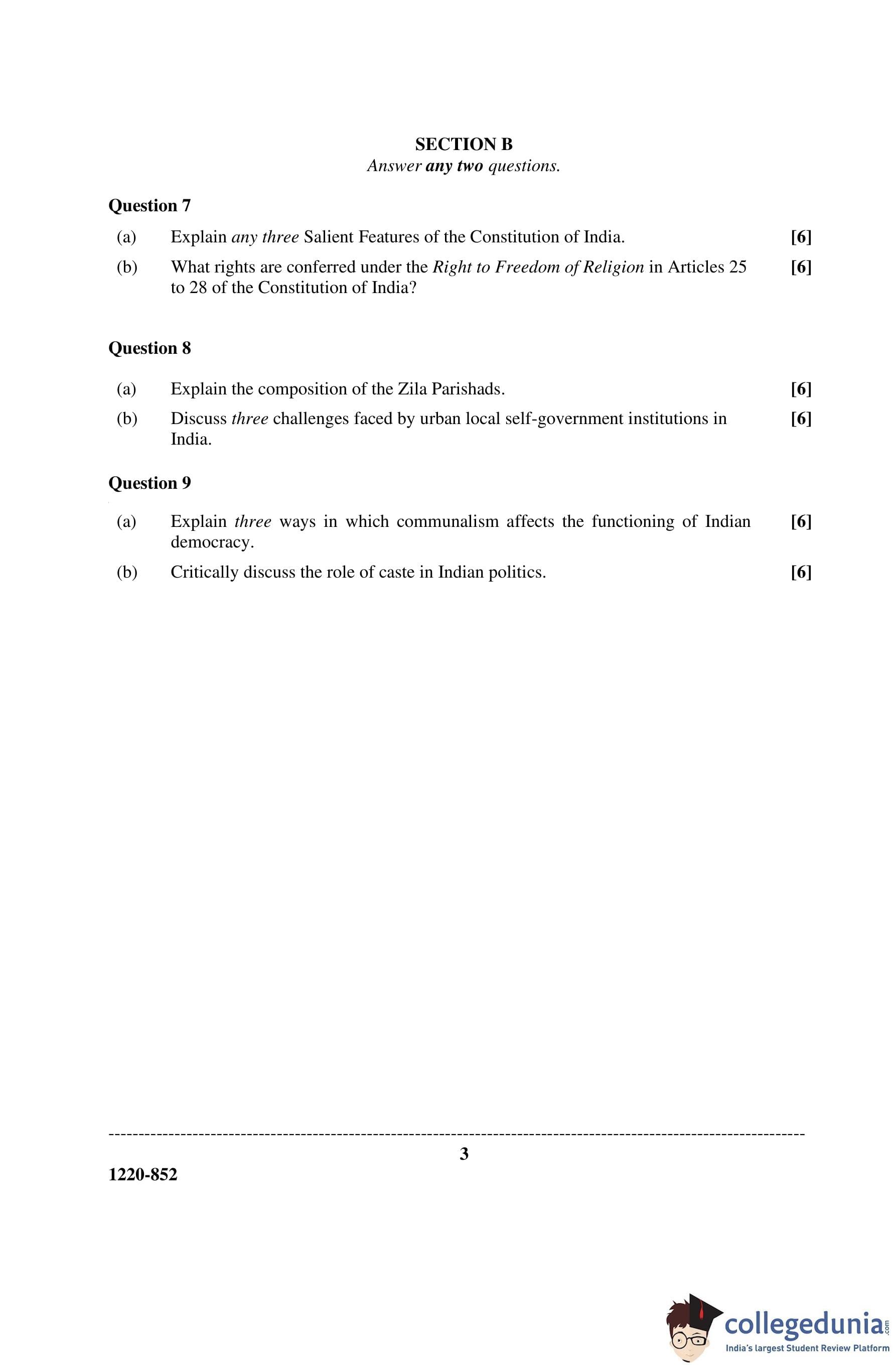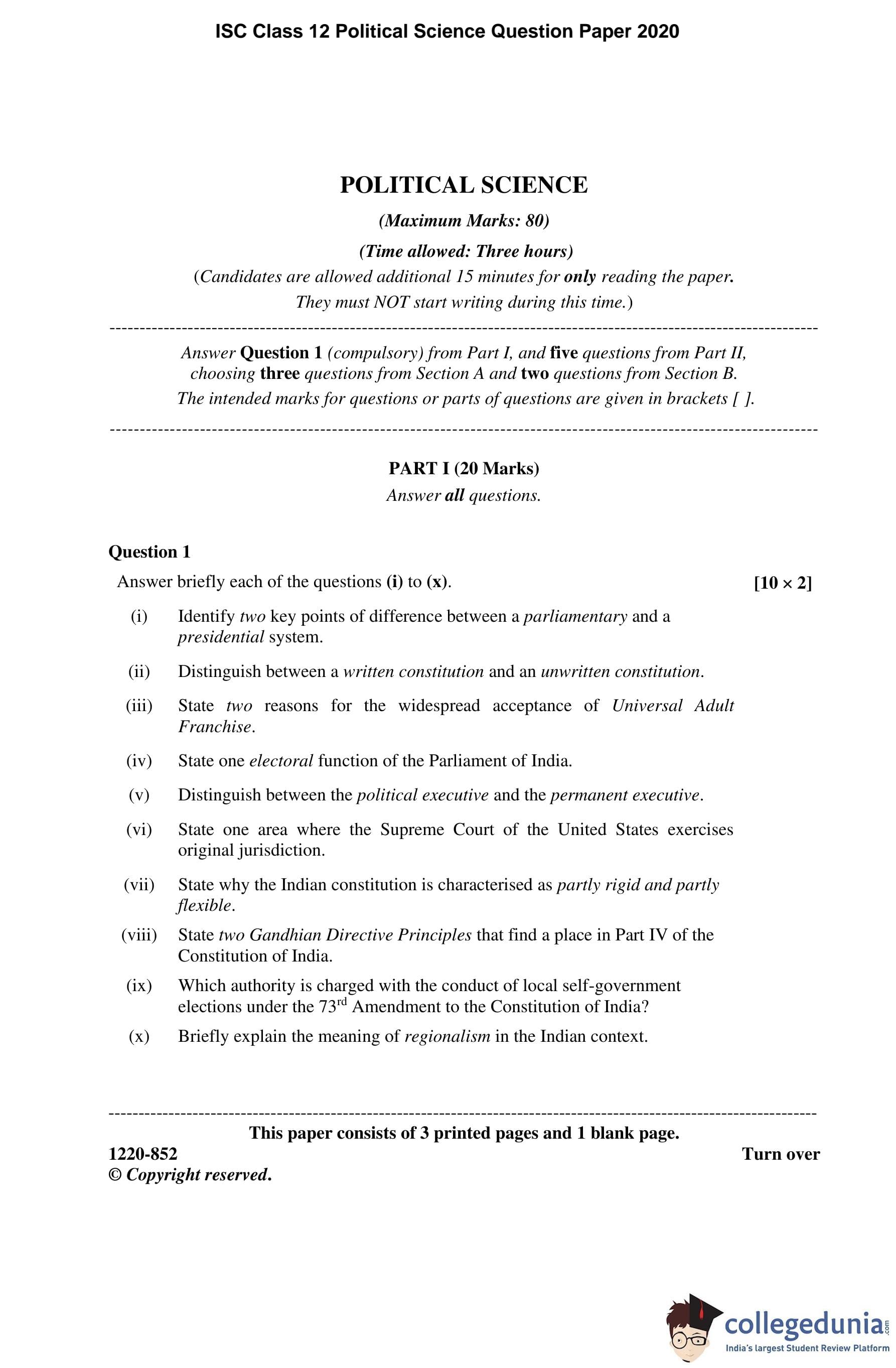 ISC Class 12 Political Science Question Paper 2020 with Answer Key