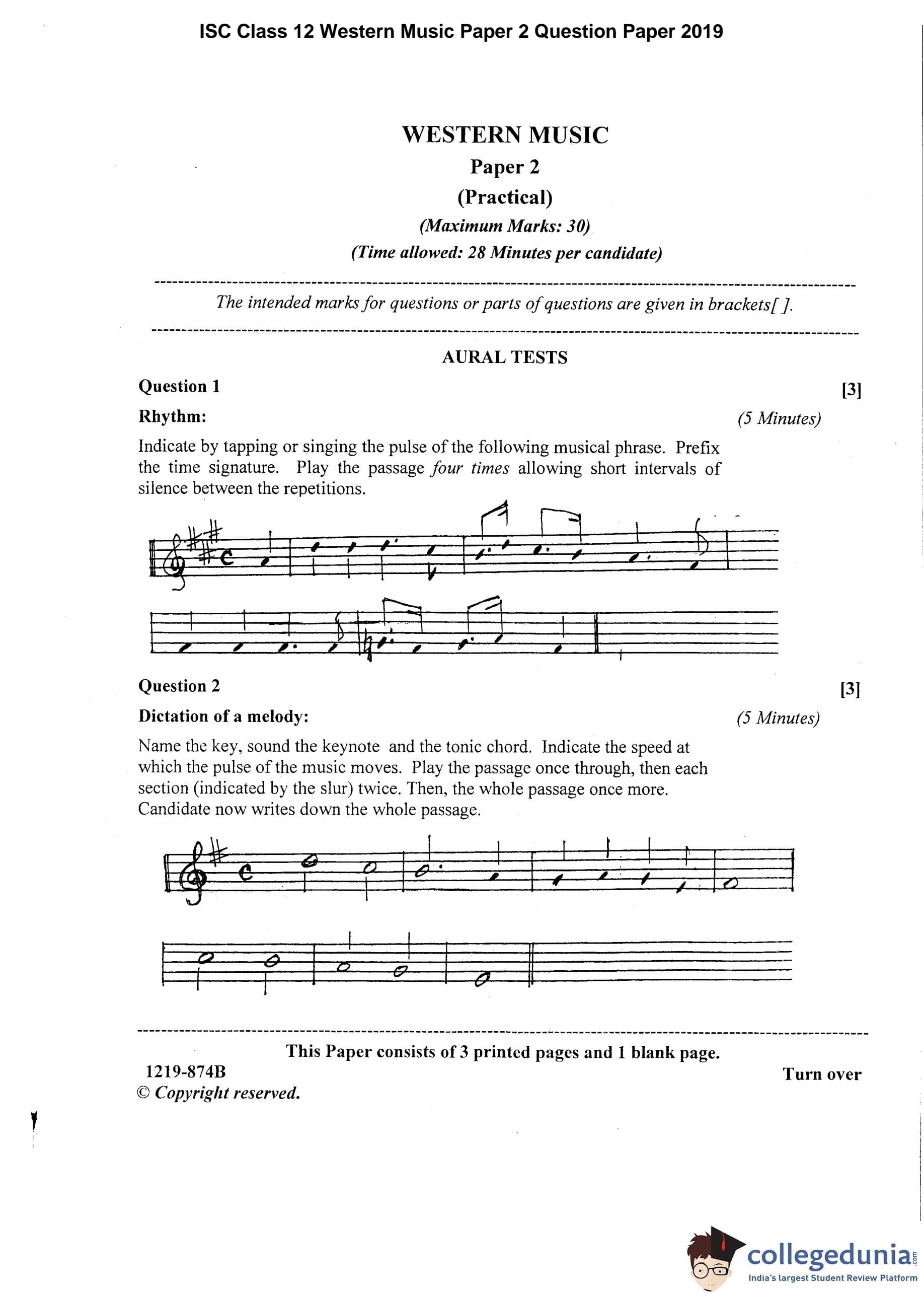 ISC Class 12 Western Music Paper 2 Question Paper 2019 with Answer Key