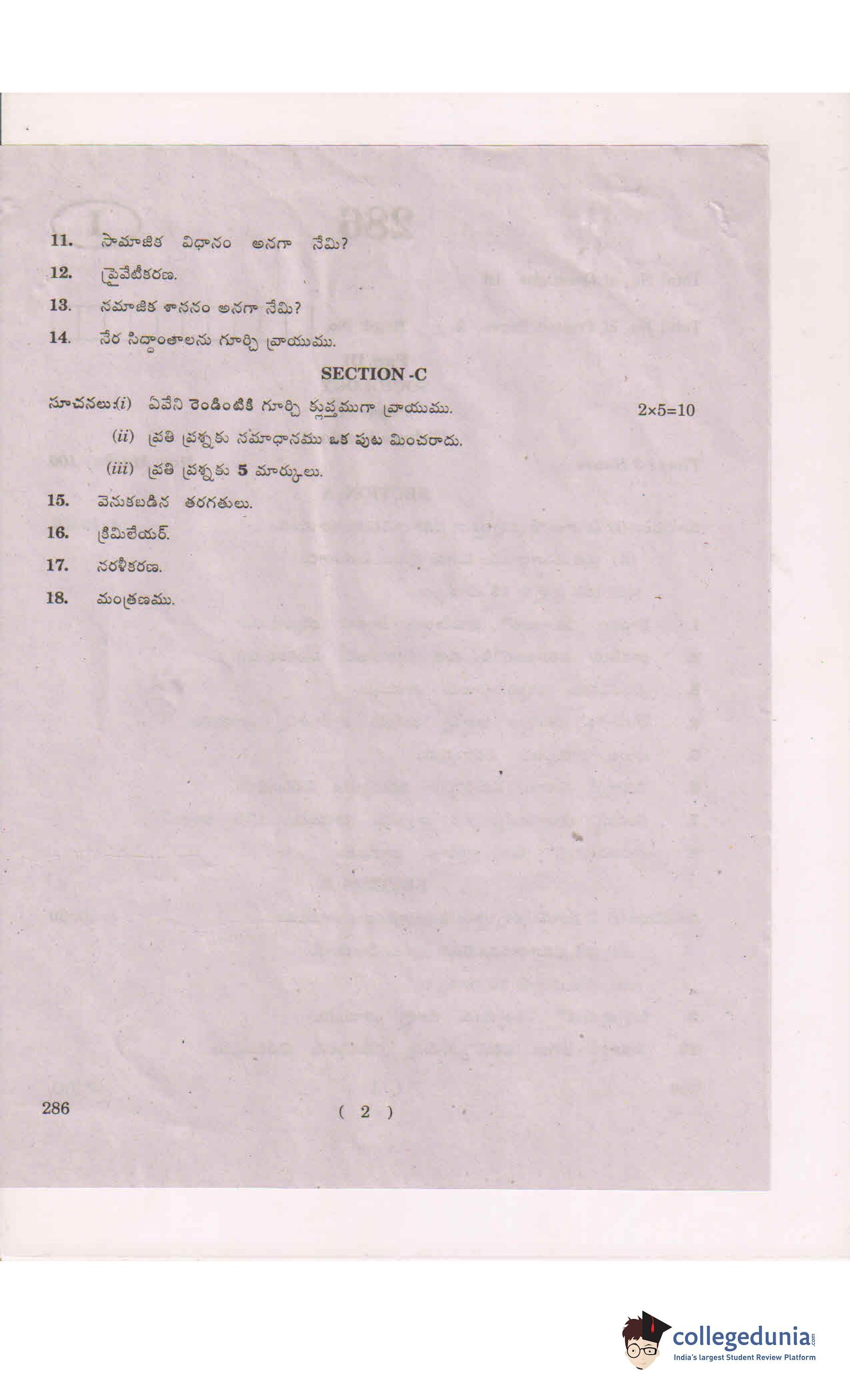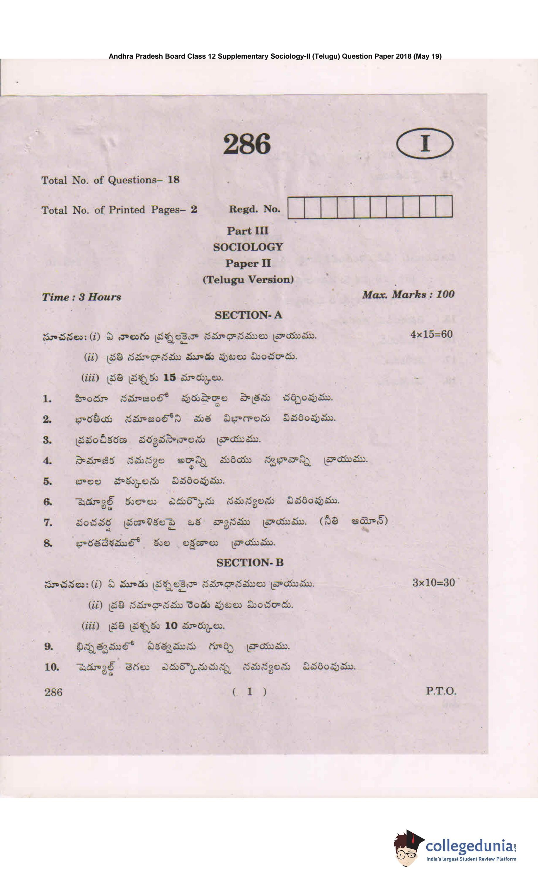 AP Intermediate 2nd year Sociology (Telugu) 286 Supplementary Question Paper 2018 (May 19)