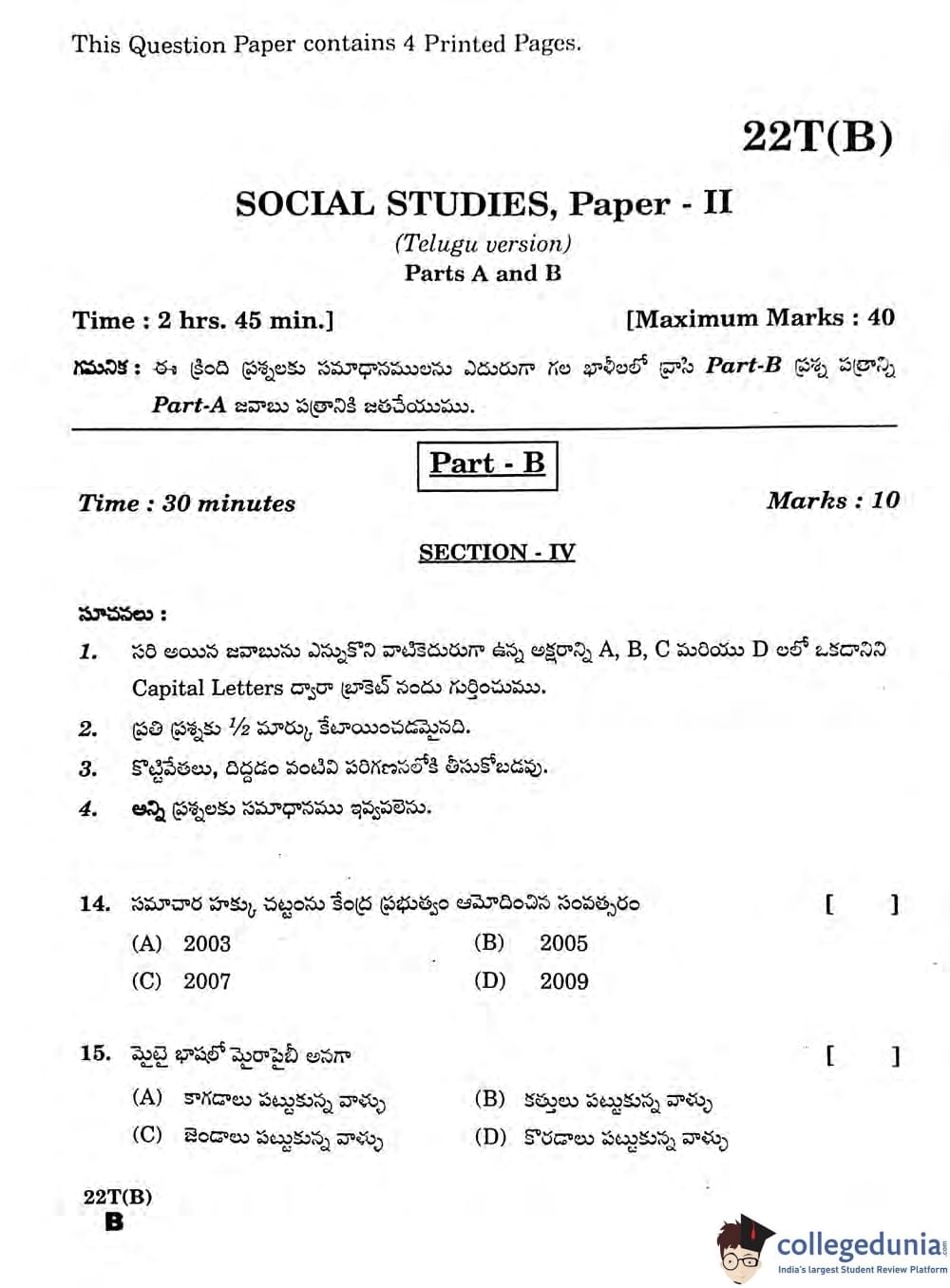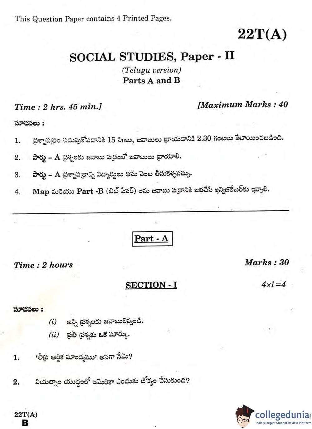 AP SSC 2019 Social Studies II (Telugu) Question Paper with Answer Key PDF is available for download. The exam was successfully conducted on March 29, 2019 by the Board of Secondary Education of Andhra Pradesh. According to initial student reaction, AP SSC Social Studies paper was rated as Easy to Moderate in difficulty level. The question paper comprised a total of 33 questions divided into four sections.