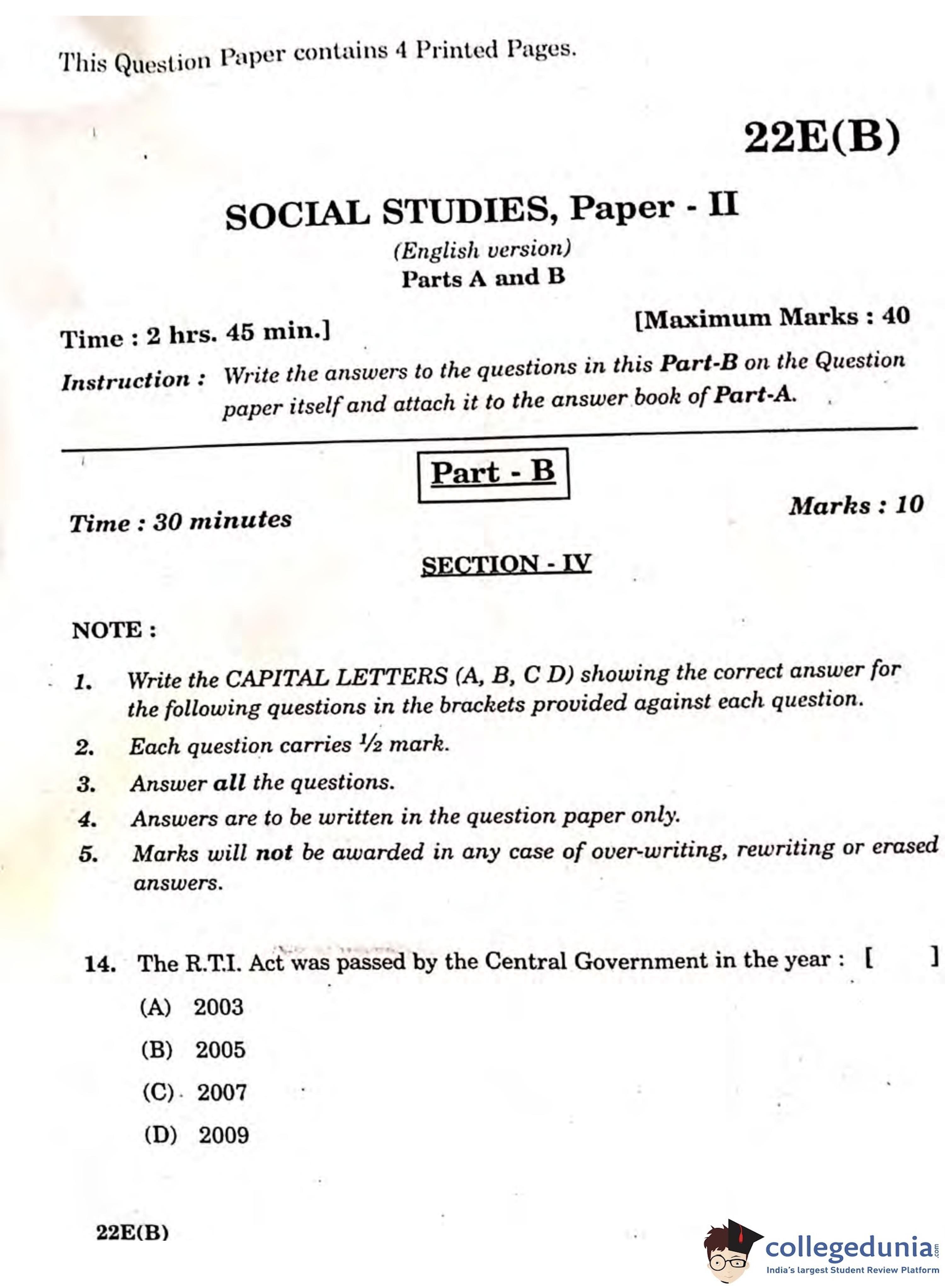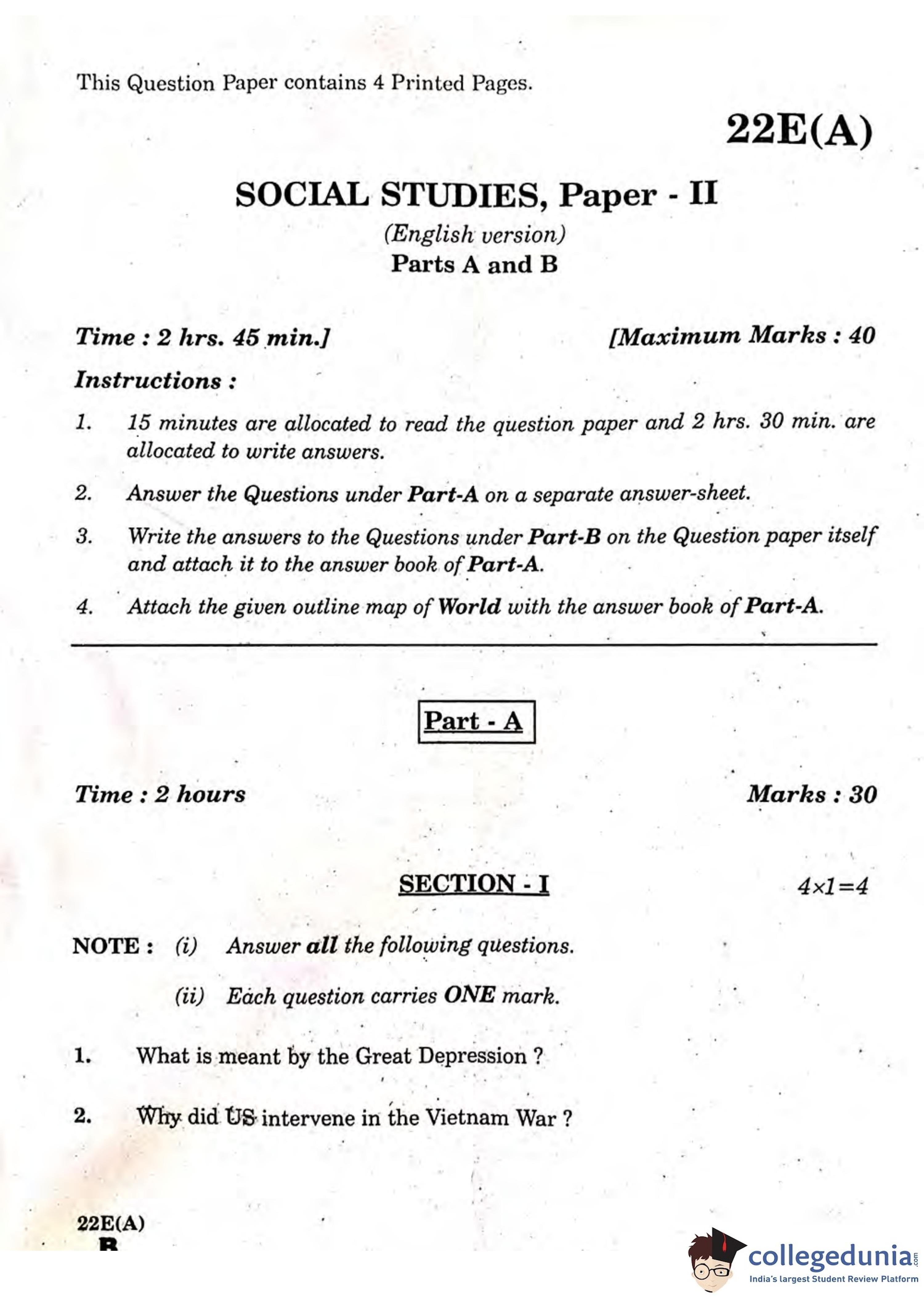AP SSC 2019 Social Studies II Question Paper with Answer Key PDF is available for download. The exam was successfully conducted on March 29, 2019 by the Board of Secondary Education of Andhra Pradesh. According to initial student reaction, AP SSC Social Studies paper was rated as Easy to Moderate in difficulty level. The question paper comprised a total of 33 questions divided into four sections.