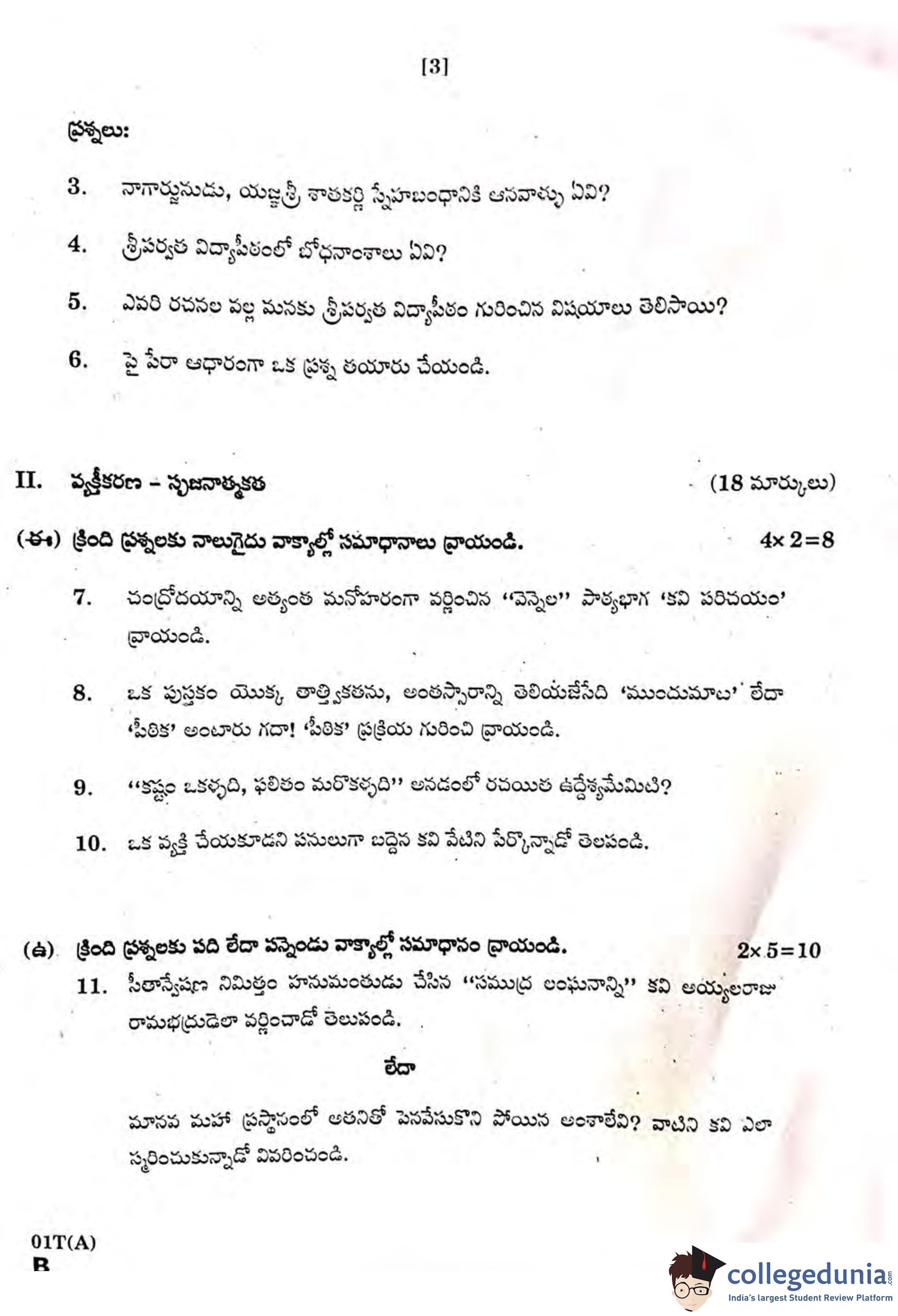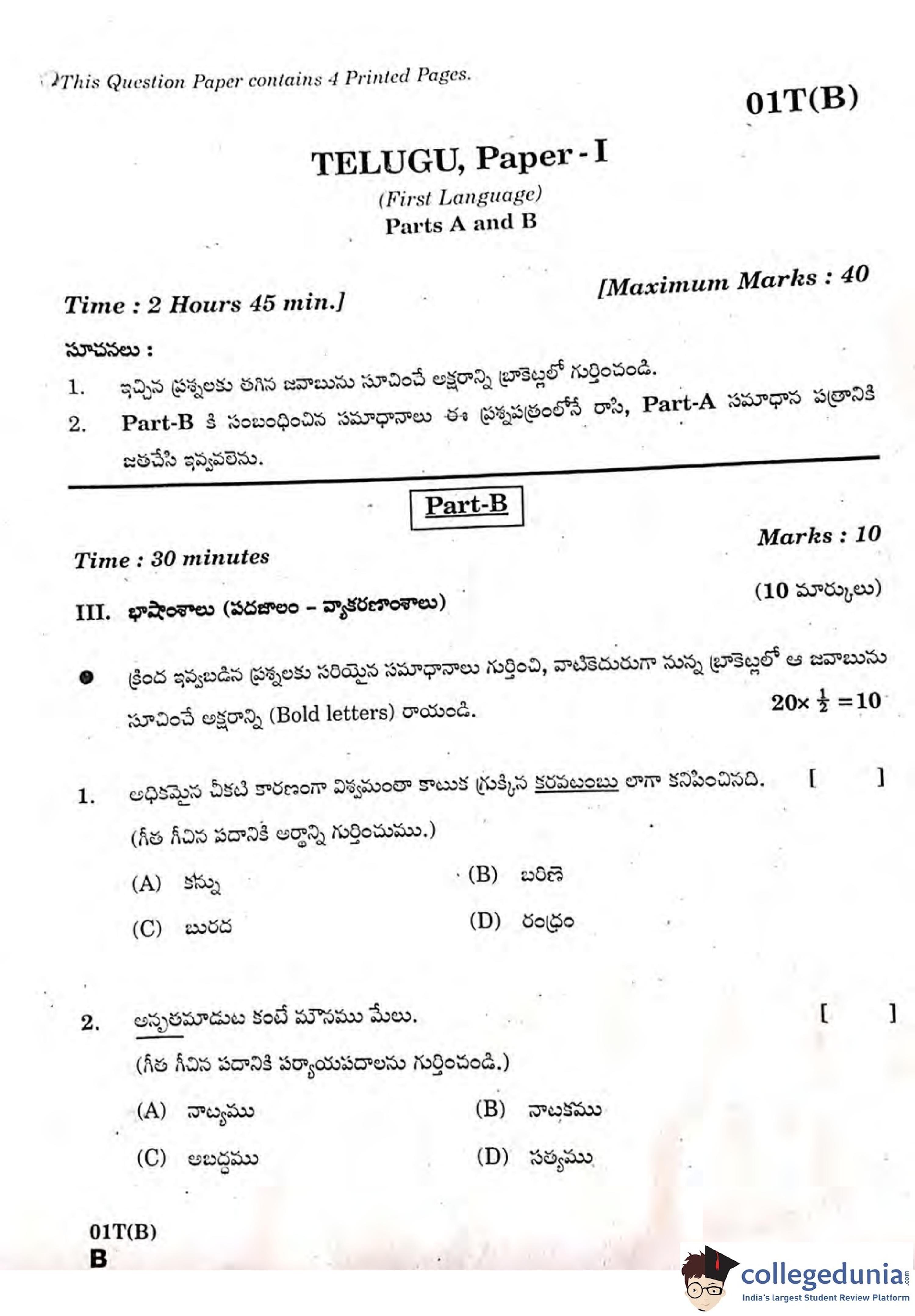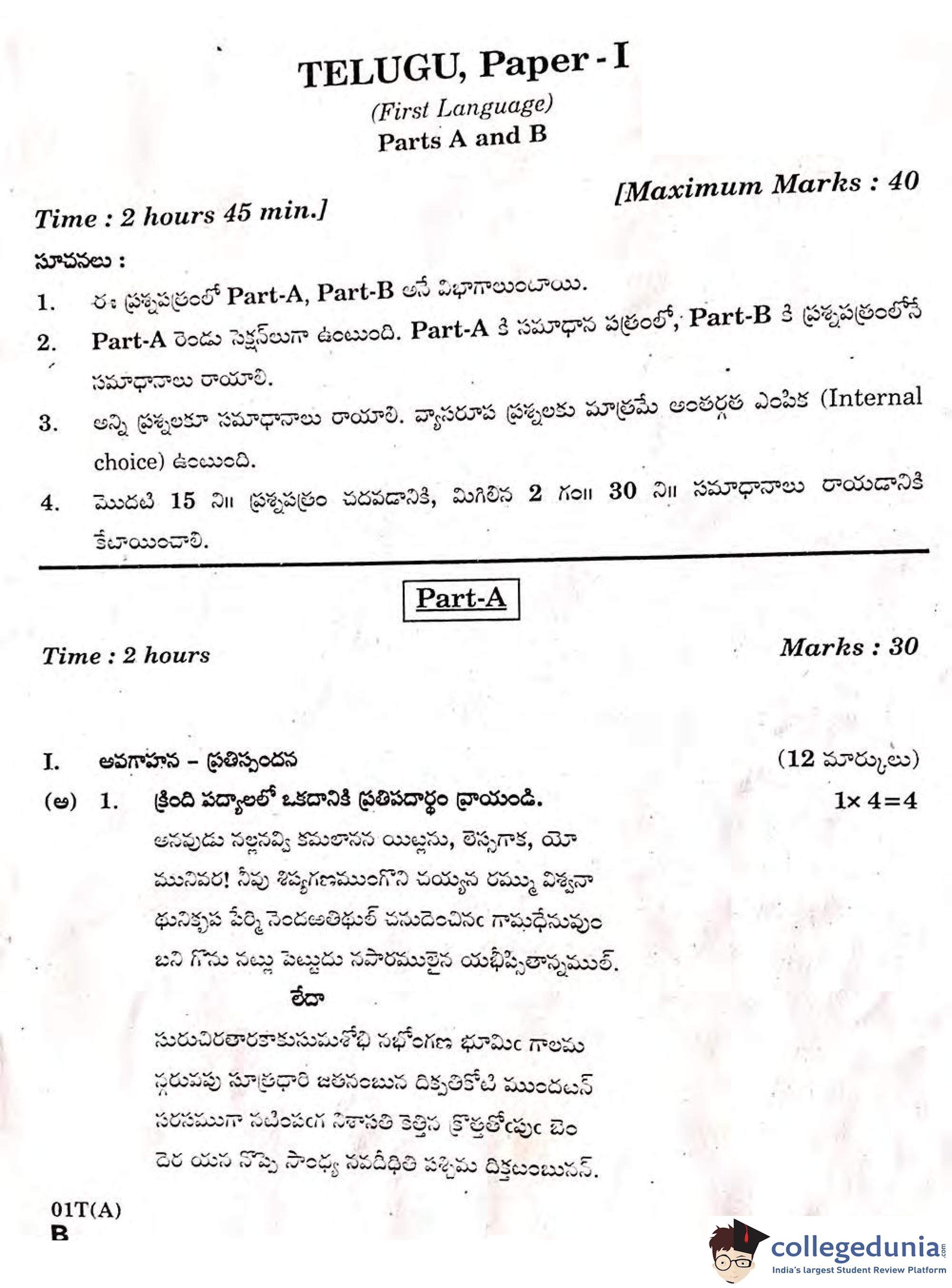 AP SSC 2019 Telugu I Question Paper with Answer Key PDF is available for download. The exam was successfully conducted on March 18, 2019 by Board of Secondary Education of Andhra Pradesh. According to initial student reaction, AP SSC Telugu Paper I was rated as Easy to Moderate in difficulty level. The question paper comprised a total of 20 questions divided into two parts.