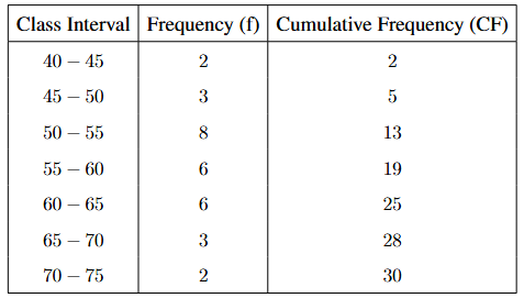 The total number of students = \( 30 \). The median class corresponds to the cumulative frequency just greater than \( \frac{30}{2} = 15 \).