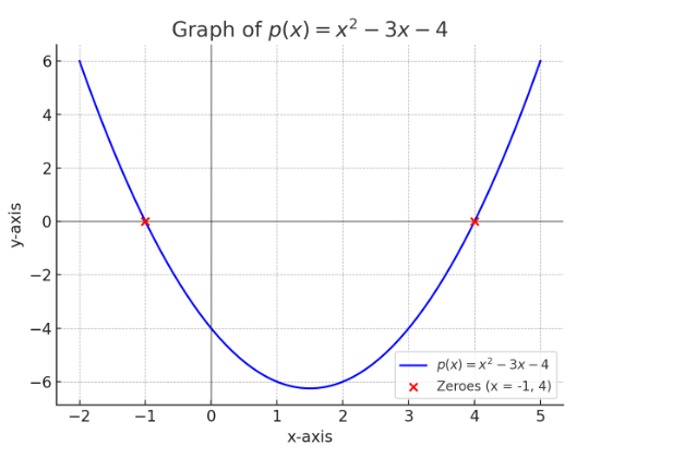 b) Draw a graph of \( p(x) = x^2 - 3x - 4 \) and hence find the zeroes of the polynomial.