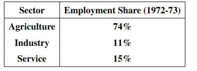 The given data represents employment distribution in 1972-73. The pie chart below visually represents the share of employment across different sectors.