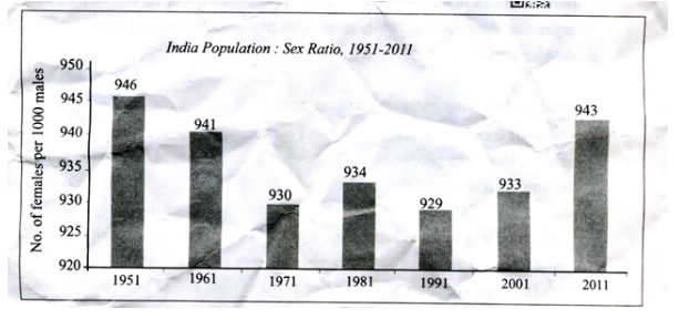It shows the number of females per 1000 males, indicating a general decline in sex ratio from 1951 to 1991, with a slight recovery in 2001 and 2011.