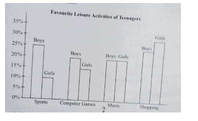 The bar-chart illustrates the favorite leisure activities of teenagers, comparing the preferences of boys and girls in categories such as Sports, Computer Games, Music, and Shopping. Quick Tip: When analyzing bar charts, focus on comparing the values represented by each bar for different categories.