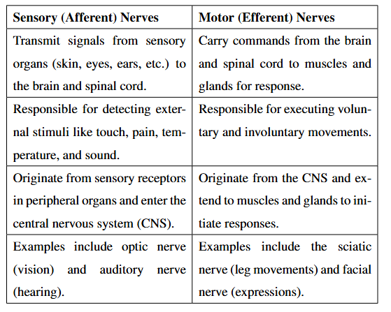 Write the differences between sensory (afferent) nerves and motor (efferent) nerves.