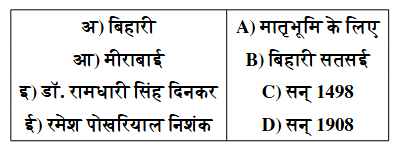 рдИ) рд░рдореЗрд╢ рдкреЛрдЦрд░рд┐рдпрд╛рд▓ рдирд┐рд╢рдВрдХ тАФ D) рд╕рдиреН 1908 Quick Tip: рдпрд╛рдж рд░рдЦреЗрдВ: - рдмрд┐рд╣рд╛рд░реА рдХреА рдкреНрд░рд╕рд┐рджреНрдз рд░рдЪрдирд╛ рд╣реИ рдмрд┐рд╣рд╛рд░реА рд╕рддрд╕рдИред - рдореАрд░рд╛рдмрд╛рдИ рдХрд╛ рдЬрдиреНрдо рд╕рдиреН 1498 рдореЗрдВ рд╣реБрдЖ рдерд╛ред - рдбреЙ. рд░рд╛рдордзрд╛рд░реА рд╕рд┐рдВрд╣ рджрд┐рдирдХрд░ рдиреЗ рдорд╛рддреГрднреВрдорд┐ рдХреЗ рд▓рд┐рдП рдЬреИрд╕реА рд░рд╛рд╖реНрдЯреНрд░рд╡рд╛рджреА рд░рдЪрдирд╛рдПрдБ рд▓рд┐рдЦреАрдВред - рд░рдореЗрд╢ рдкреЛрдЦрд░рд┐рдпрд╛рд▓ рдирд┐рд╢рдВрдХ рдХрд╛ рдЬрдиреНрдо рд╕рдиреН 1908 рдореЗрдВ рд╣реБрдЖ рдерд╛ред