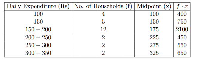 Thus, the mean daily expenditure on food is ₹216. Quick Tip: For grouped data, the weighted mean formula is helpful in calculating the mean. Always ensure you calculate the midpoints correctly and sum \( f \cdot x \) before applying the formula.