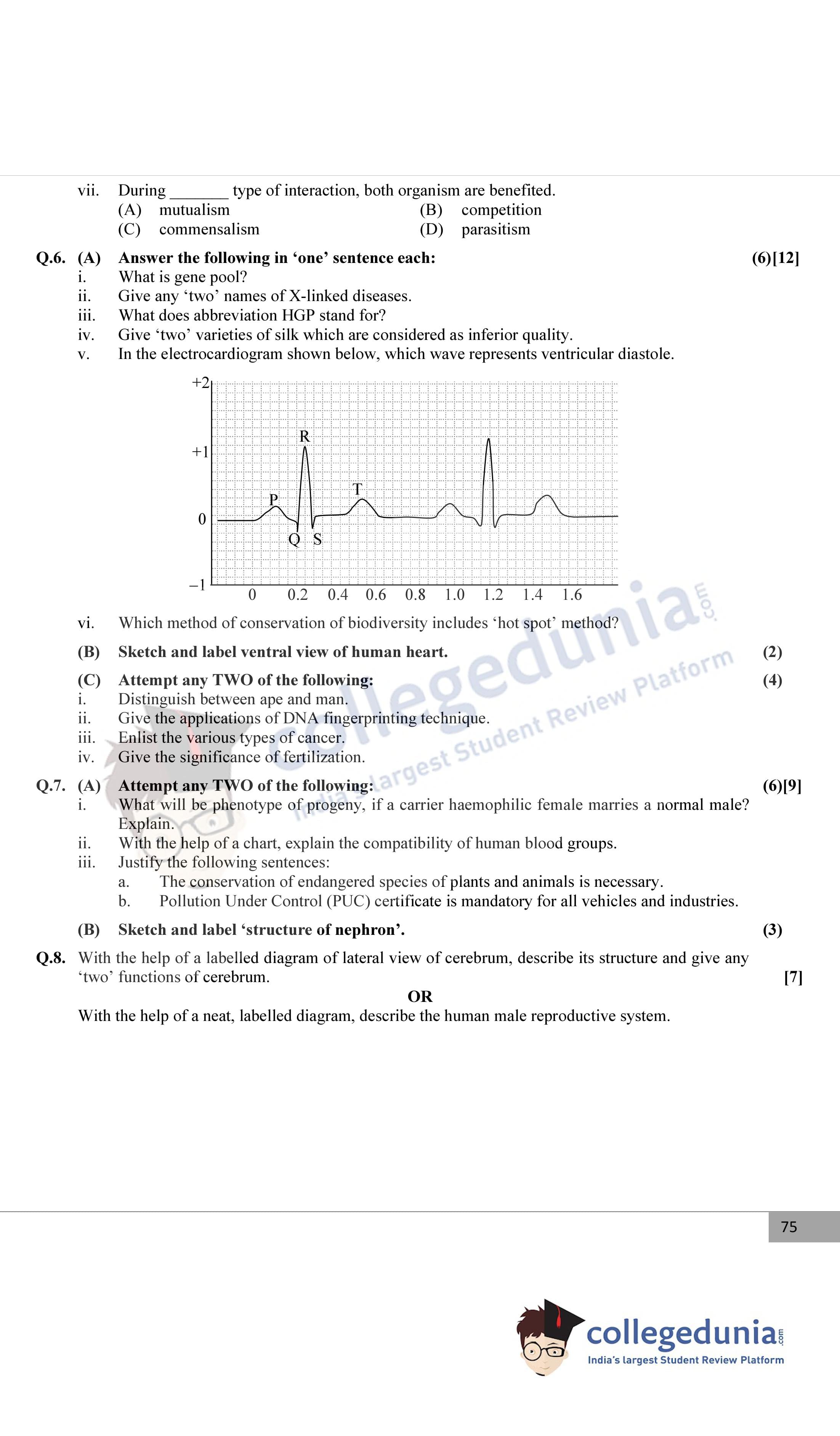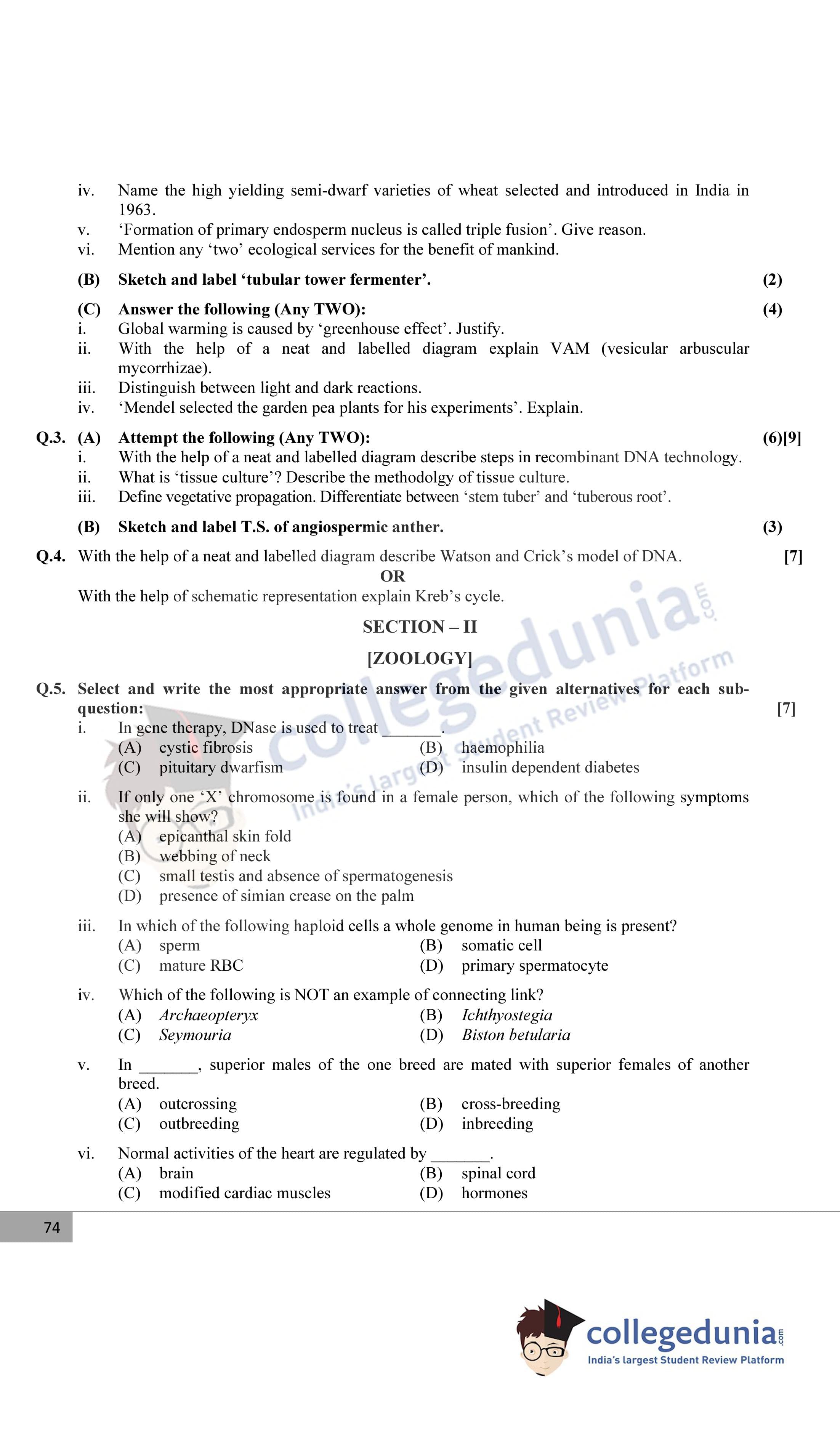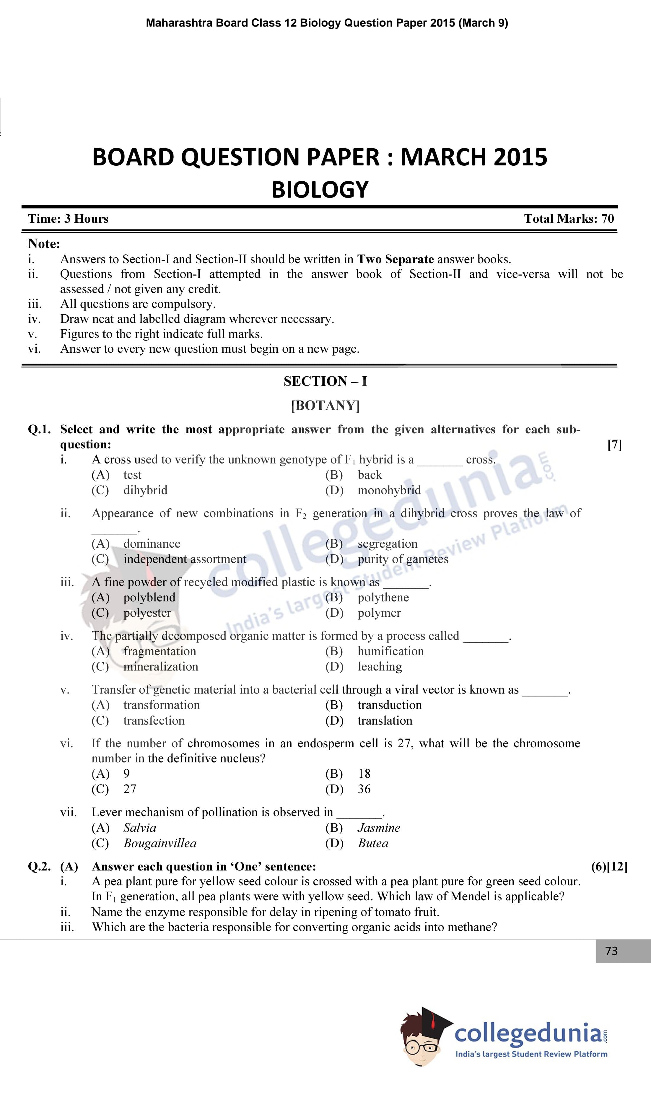 Maharashtra Board Class 12 Biology Question Paper 2015 with Answer Key is available for download. The exam was conducted by the Maharashtra State Board of Secondary & Higher Secondary Education (MSBSHSE) on March 9, 2015 in the Morning Session 11.00 AM to 2.00 PM. The medium of paper was English. The question paper comprised a total of 8 questions divided among 2 sections.
