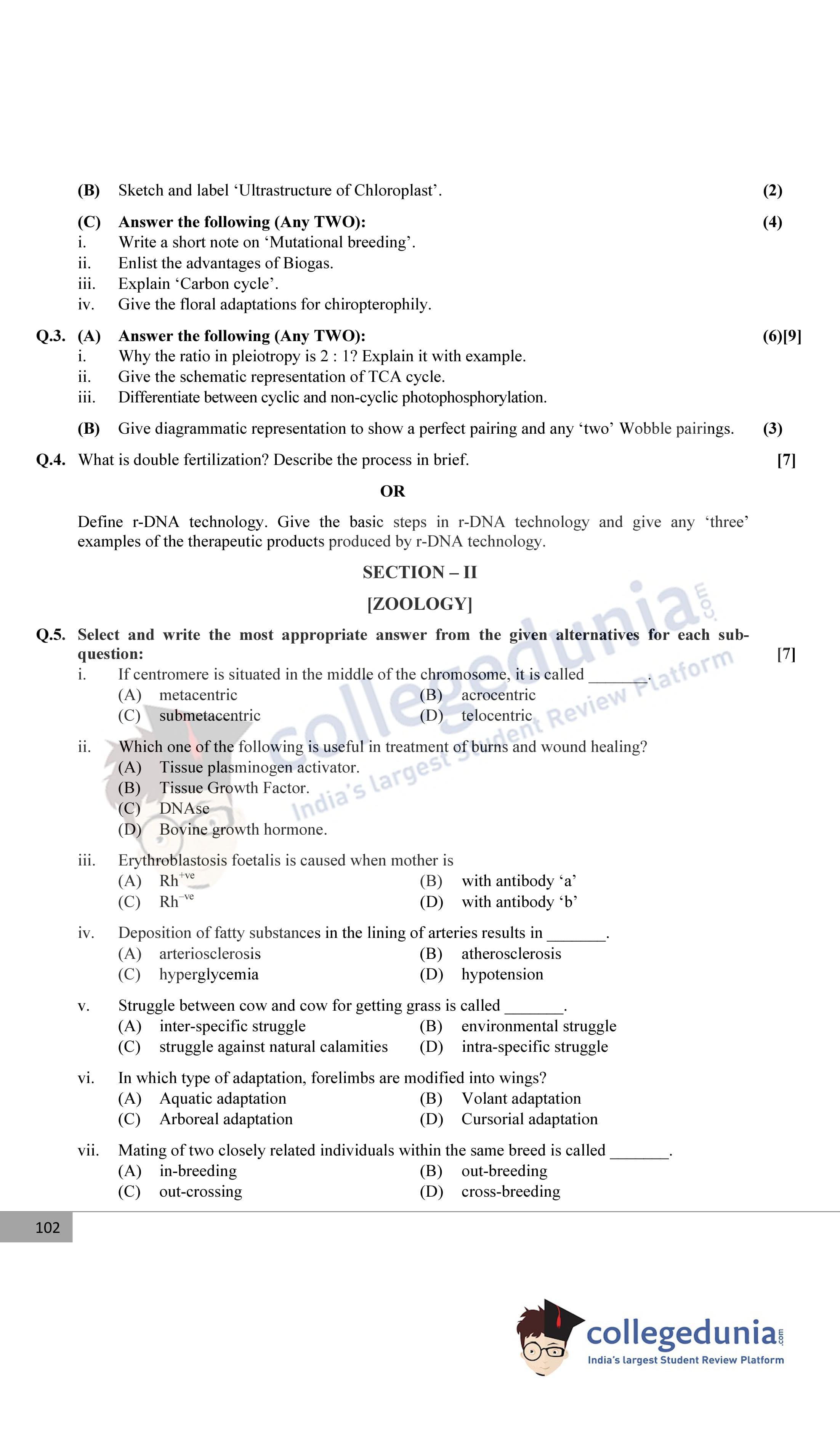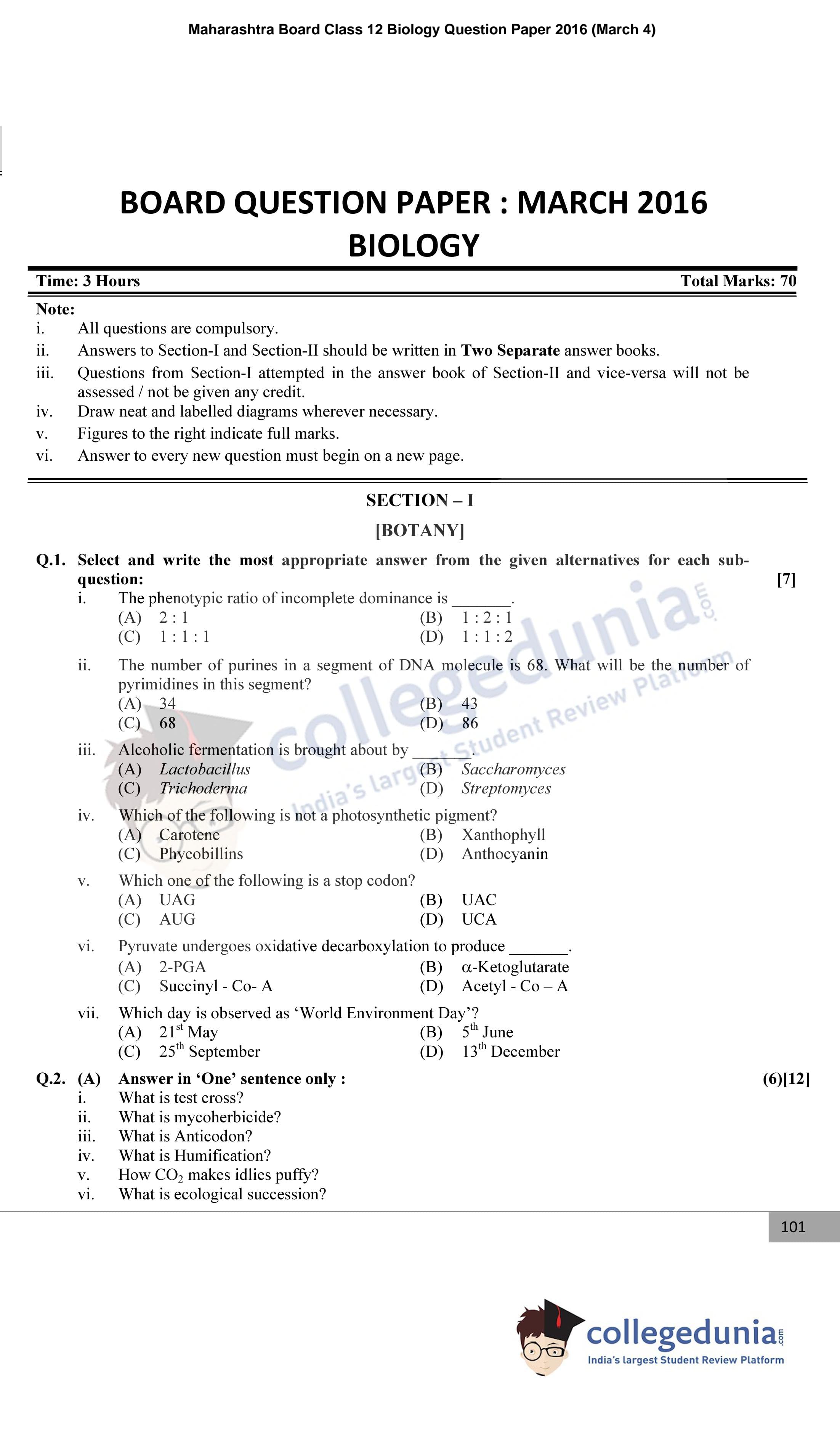Maharashtra Board Class 12 Biology Question Paper 2016 with Answer Key is available for download. The exam was conducted by the Maharashtra State Board of Secondary & Higher Secondary Education (MSBSHSE) on March 4, 2016 in the Morning Session 11.00 AM to 2.00 PM. The medium of paper was English. The question paper comprised a total of 8 questions divided among 2 sections.