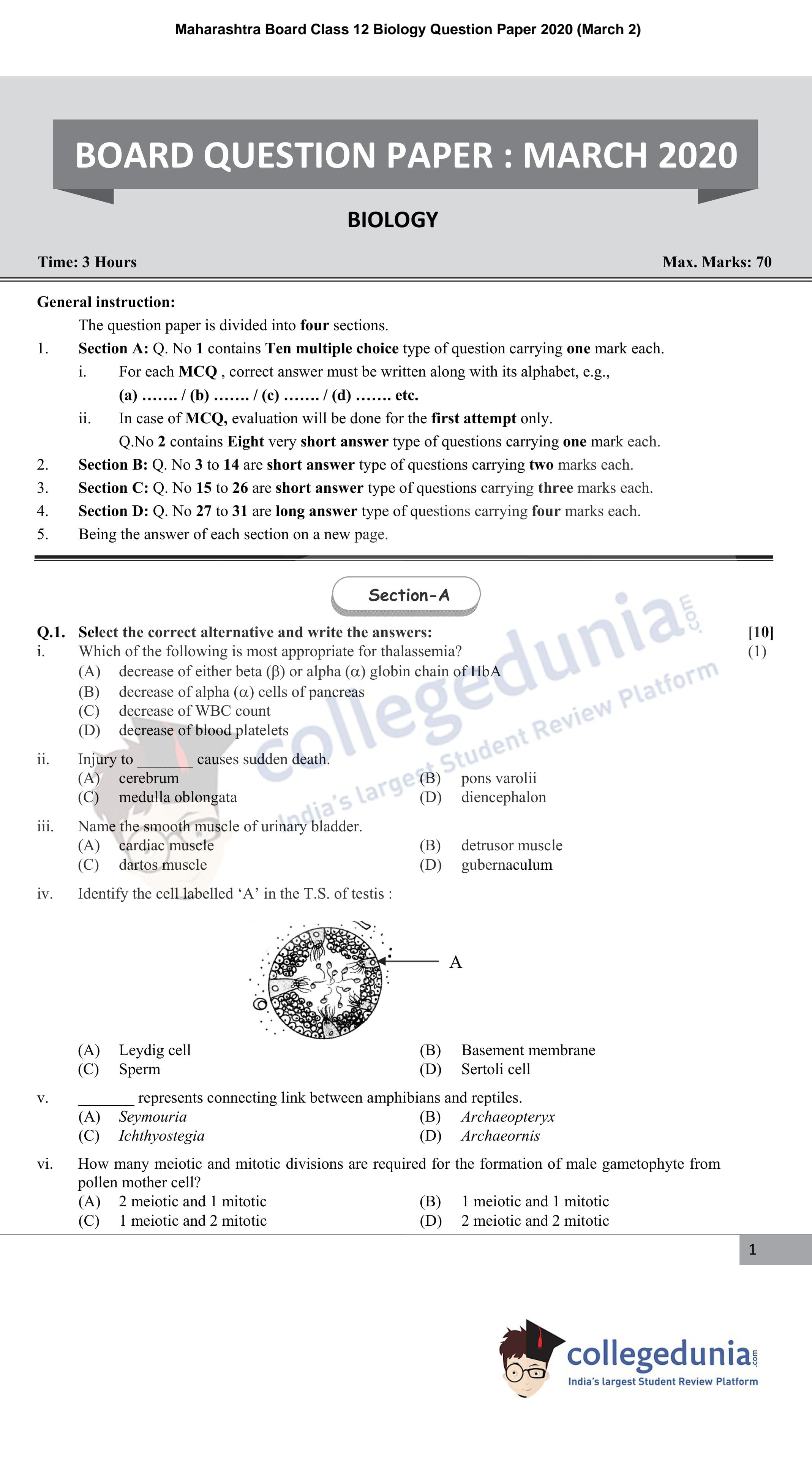 Maharashtra Board Class 12 Biology Question Paper 2020 with Answer Key is available for download. The exam was conducted by the Maharashtra State Board of Secondary & Higher Secondary Education (MSBSHSE) on March 2, 2020 in the Morning Session 11.00 AM to 2.00 PM. The medium of paper was English. The question paper comprised a total of 31 questions divided among 4 sections.