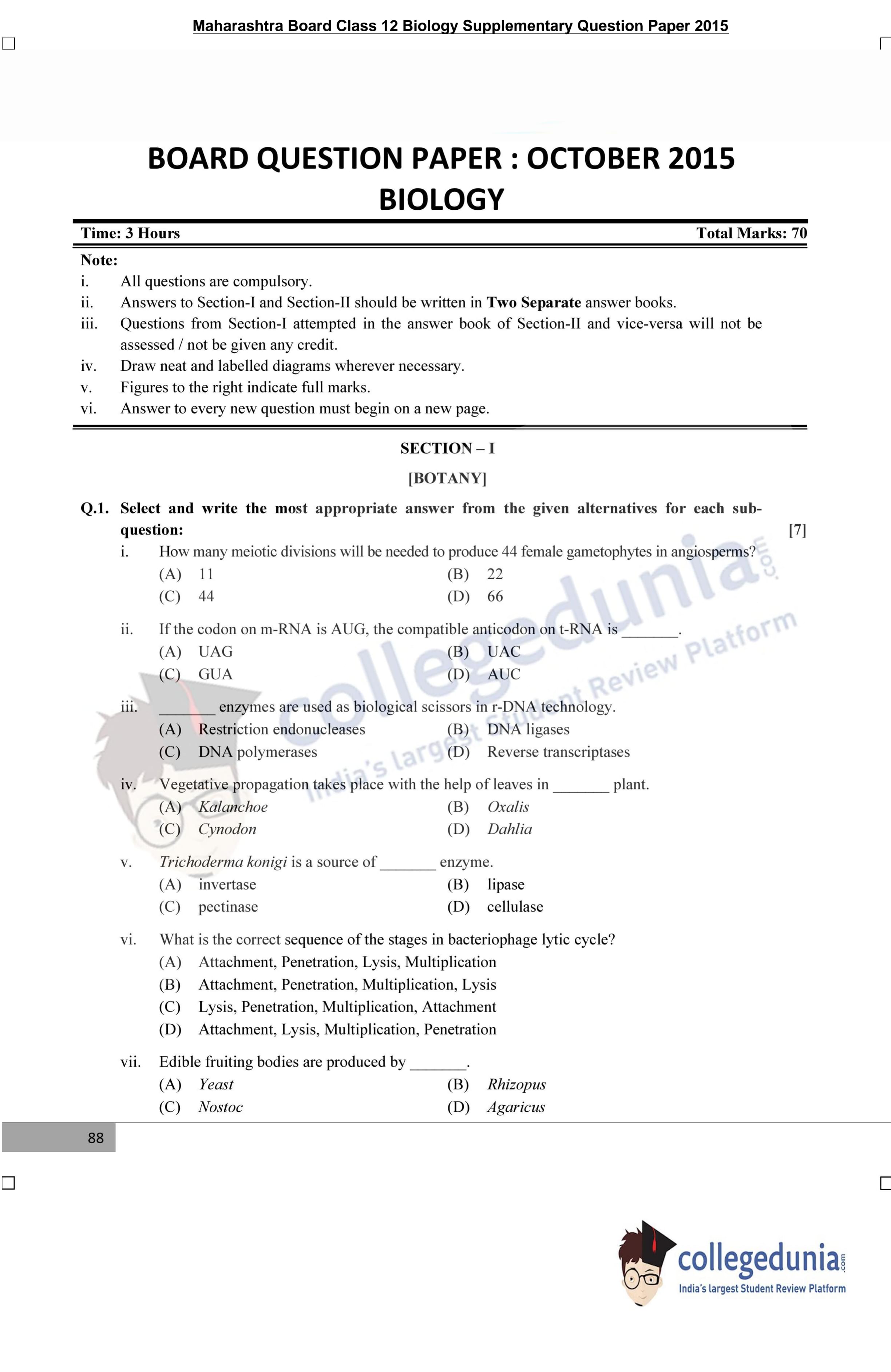 Maharashtra Board Class 12 Biology Supplementary Question Paper 2015 with Answer Key is available for download. The exam was conducted by the Maharashtra State Board of Secondary & Higher Secondary Education (MSBSHSE). The medium of paper was English. The question paper comprised a total of 8 questions divided among 2 sections.