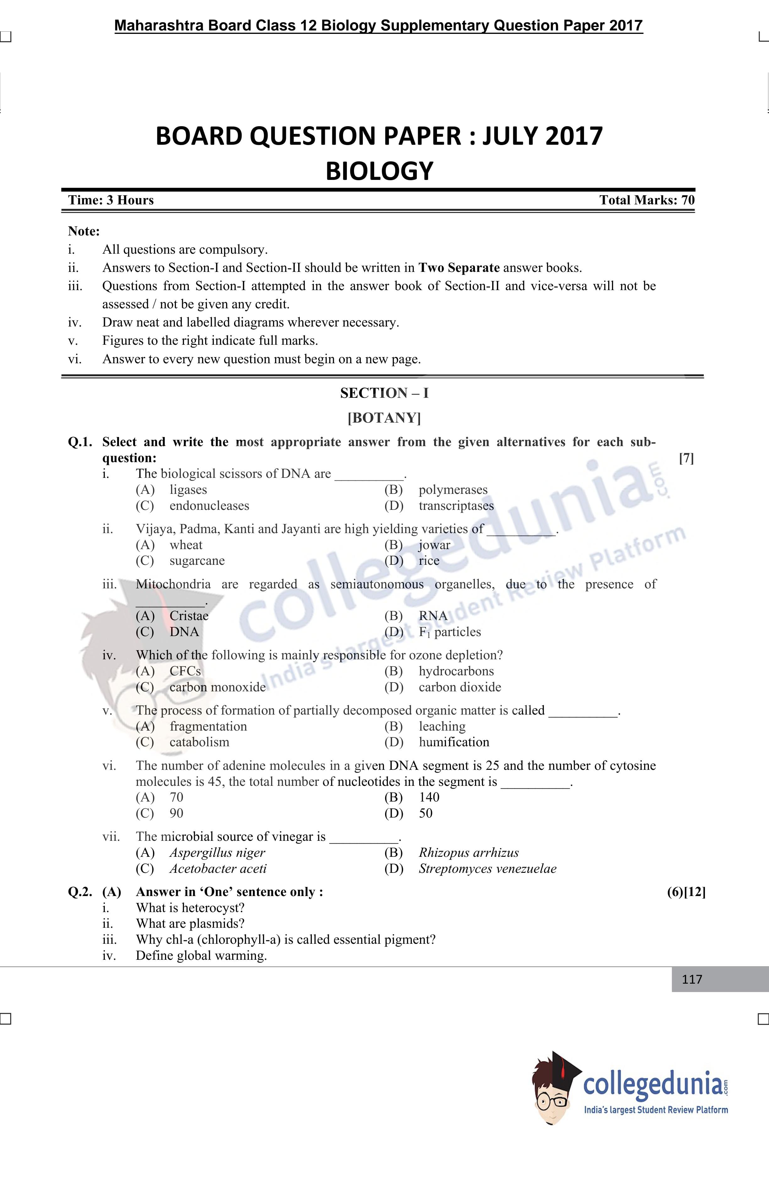 | Maharashtra Board Class 12 Biology Question Paper 2017 PDF | Maharashtra Board Class 12 Biology Answer Key 2017 PDF |