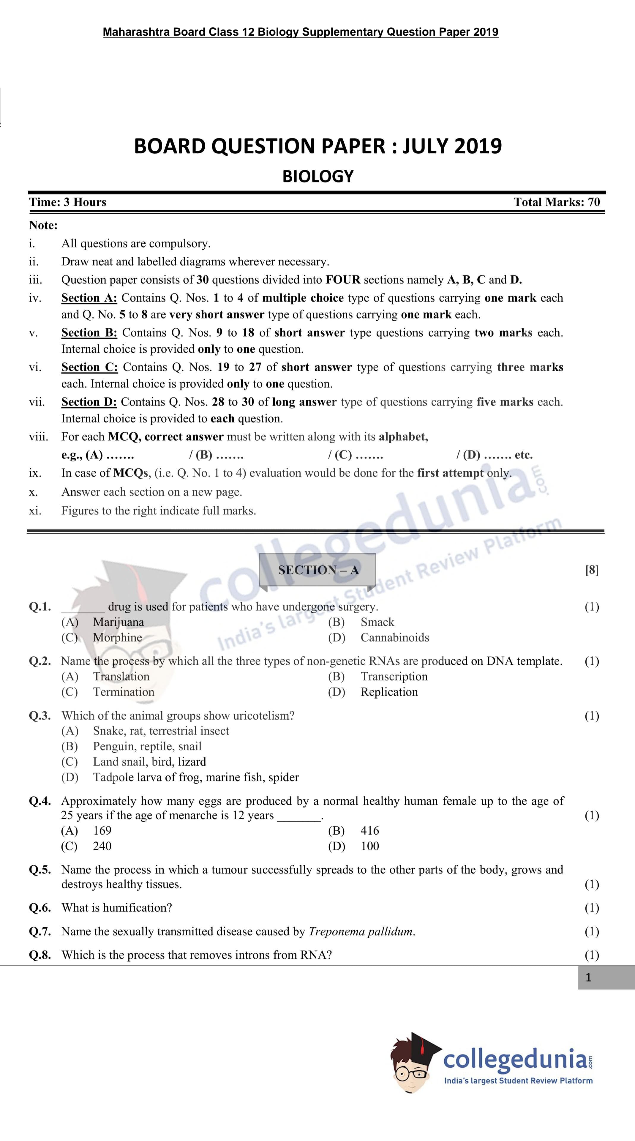Maharashtra Board Class 12 Biology Supplementary Question Paper 2019 with Answer Key is available for download. The exam was conducted by the Maharashtra State Board of Secondary & Higher Secondary Education (MSBSHSE) . The medium of paper was English. The question paper comprised a total of 30 questions divided among 4 sections.
