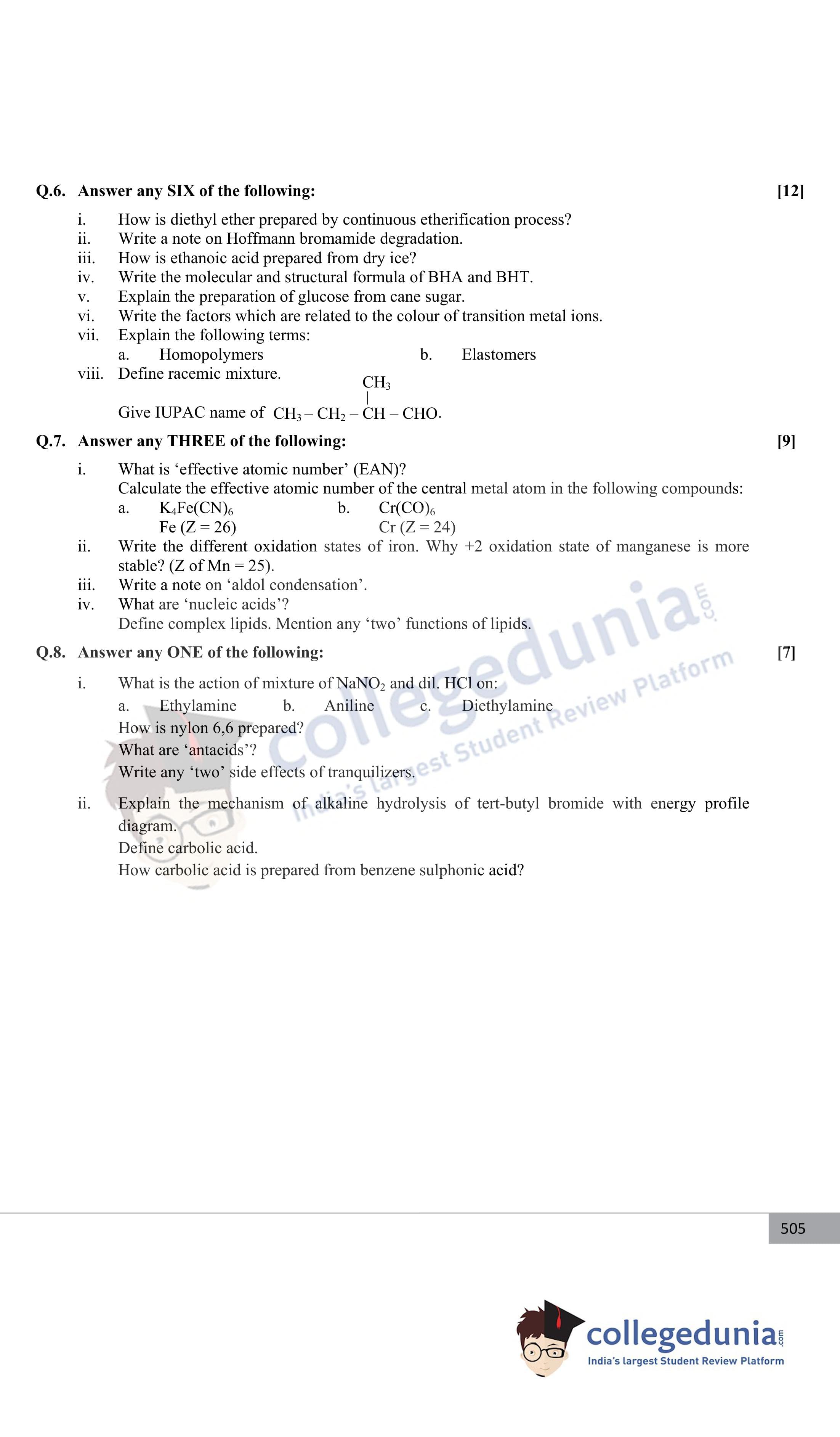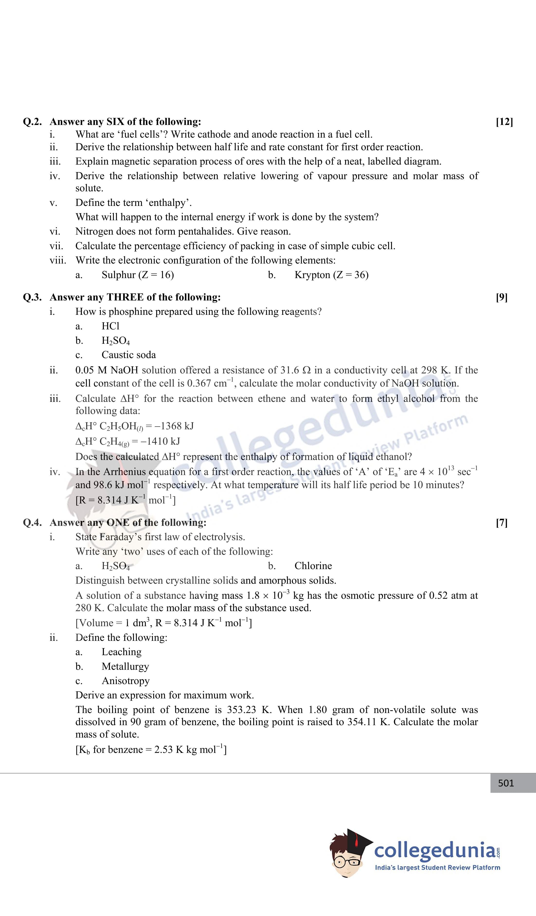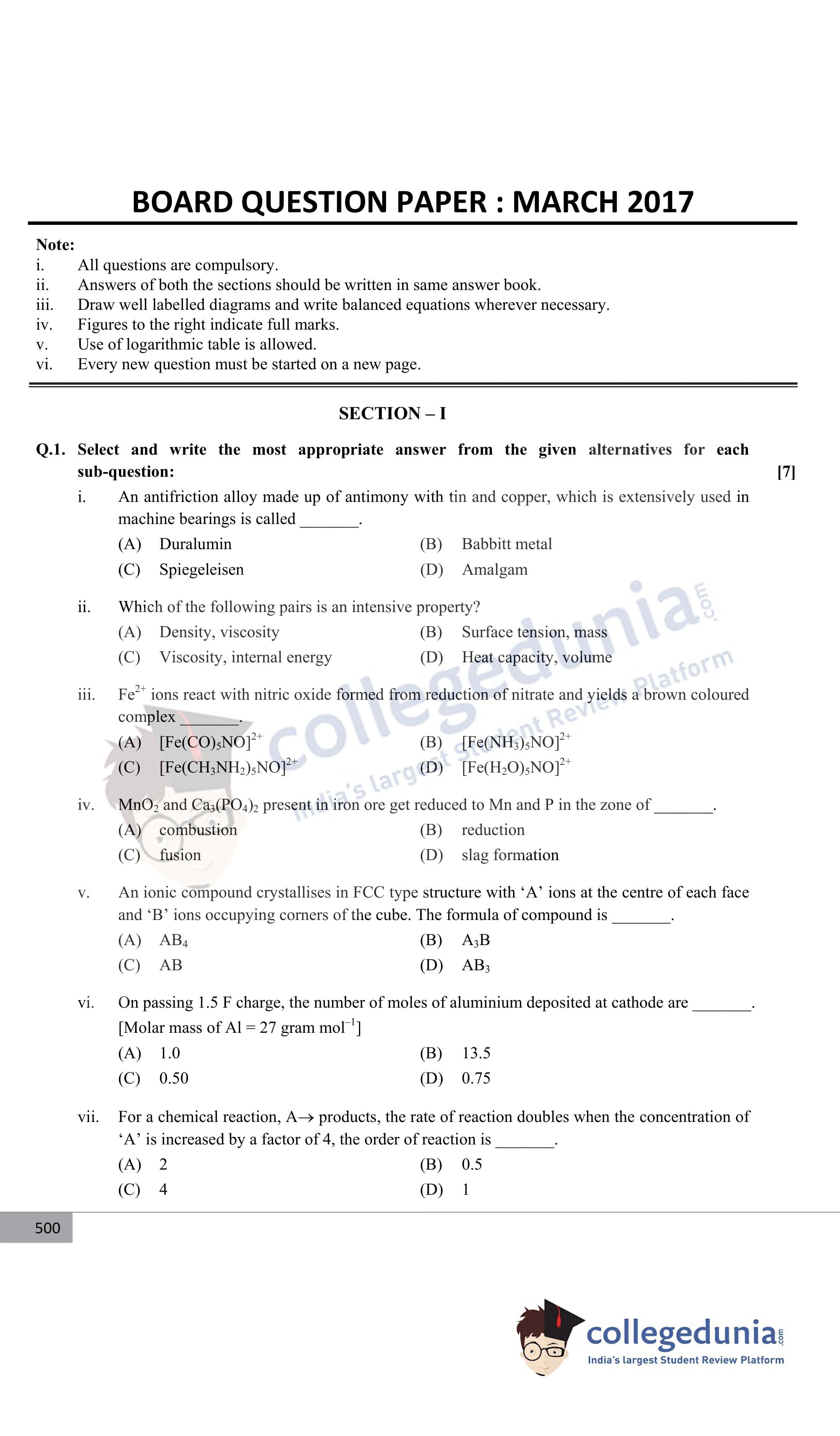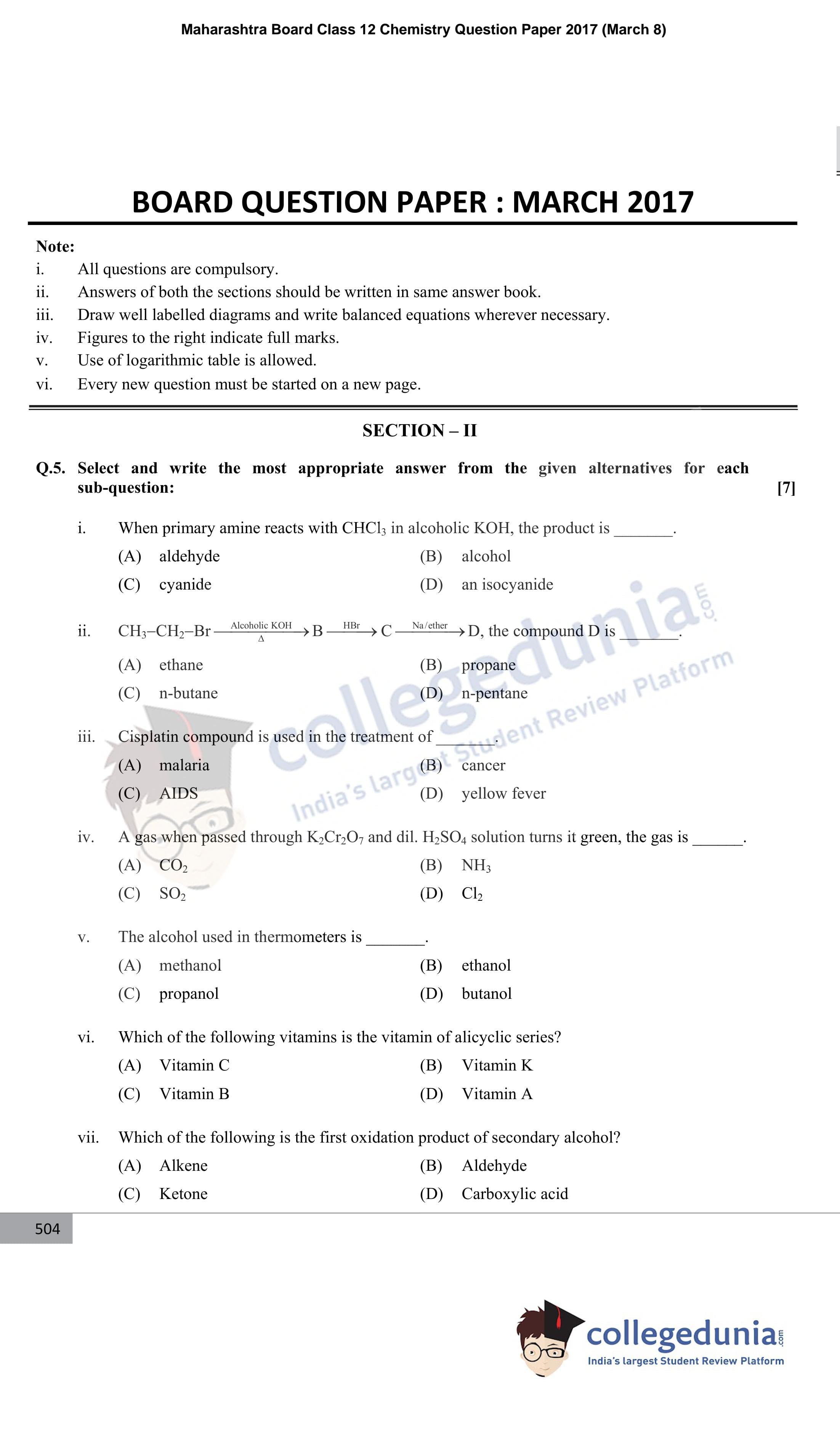 Maharashtra Board Class 12 Chemistry Question Paper 2017 with Answer Key (March 8)