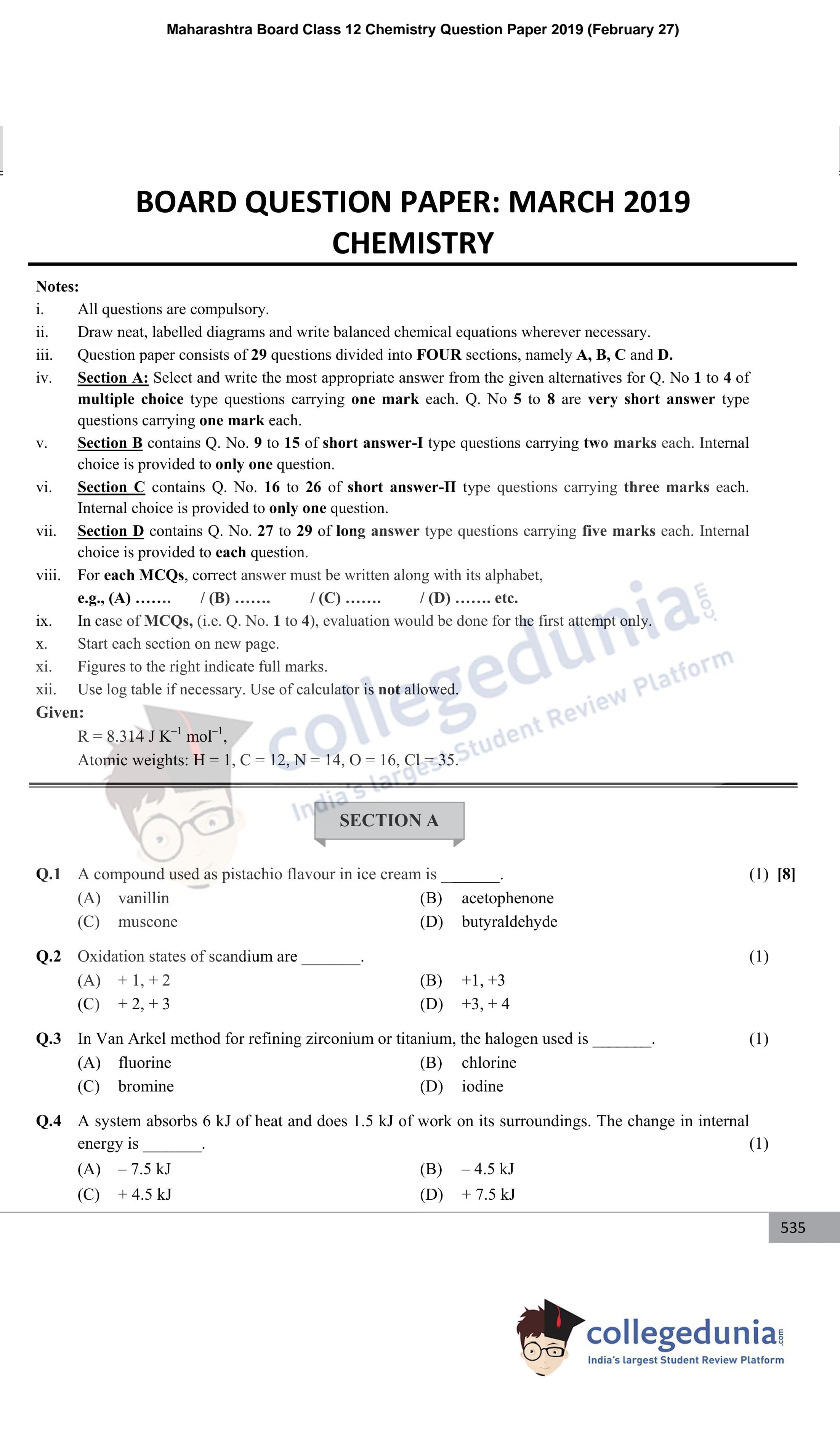 Maharashtra Board Class 12 Chemistry Question Paper 2019 with Answer Key (February 27)