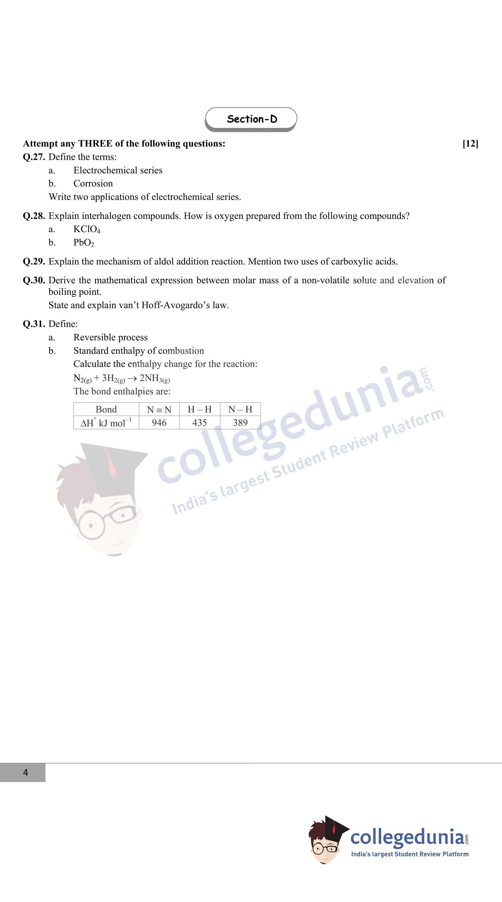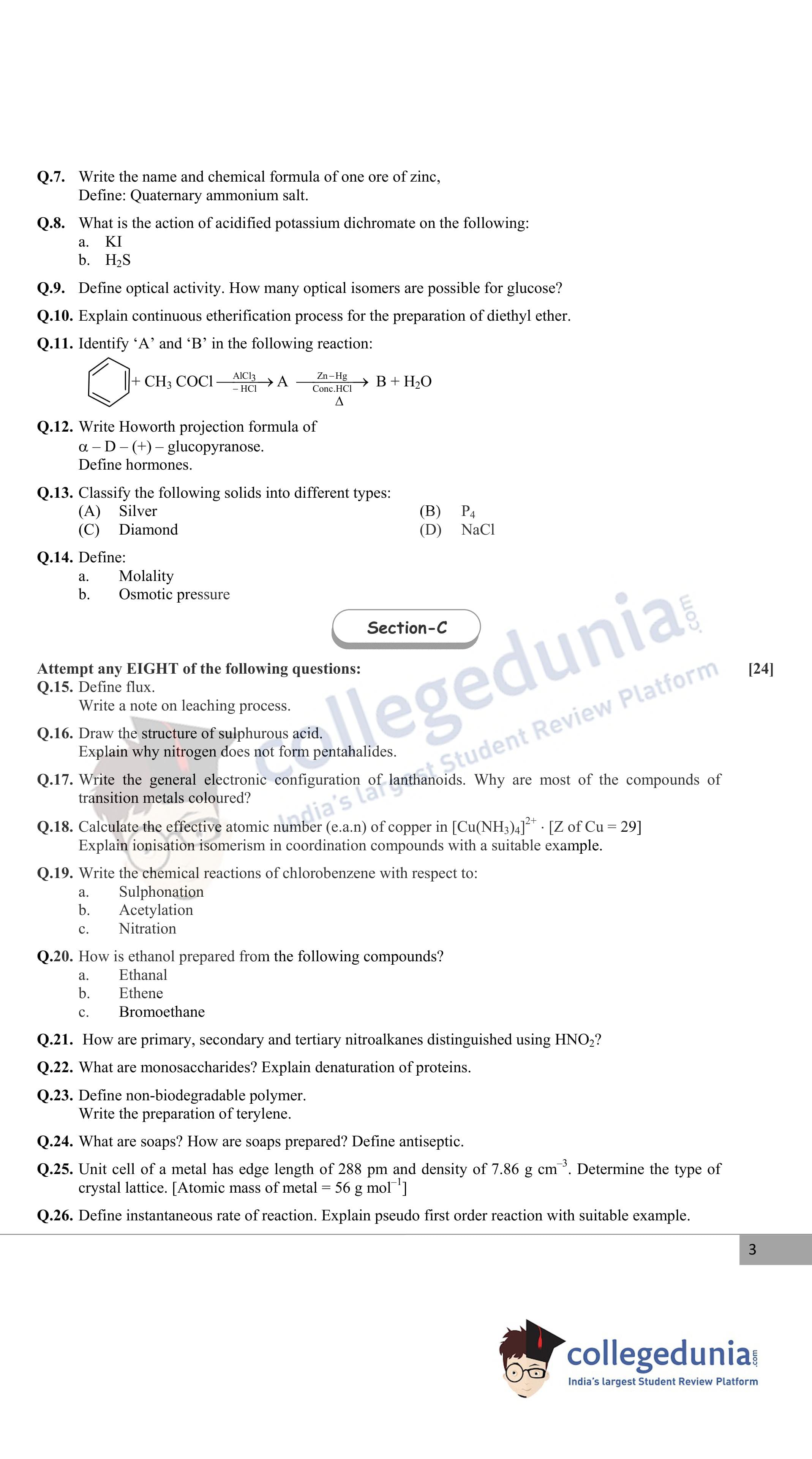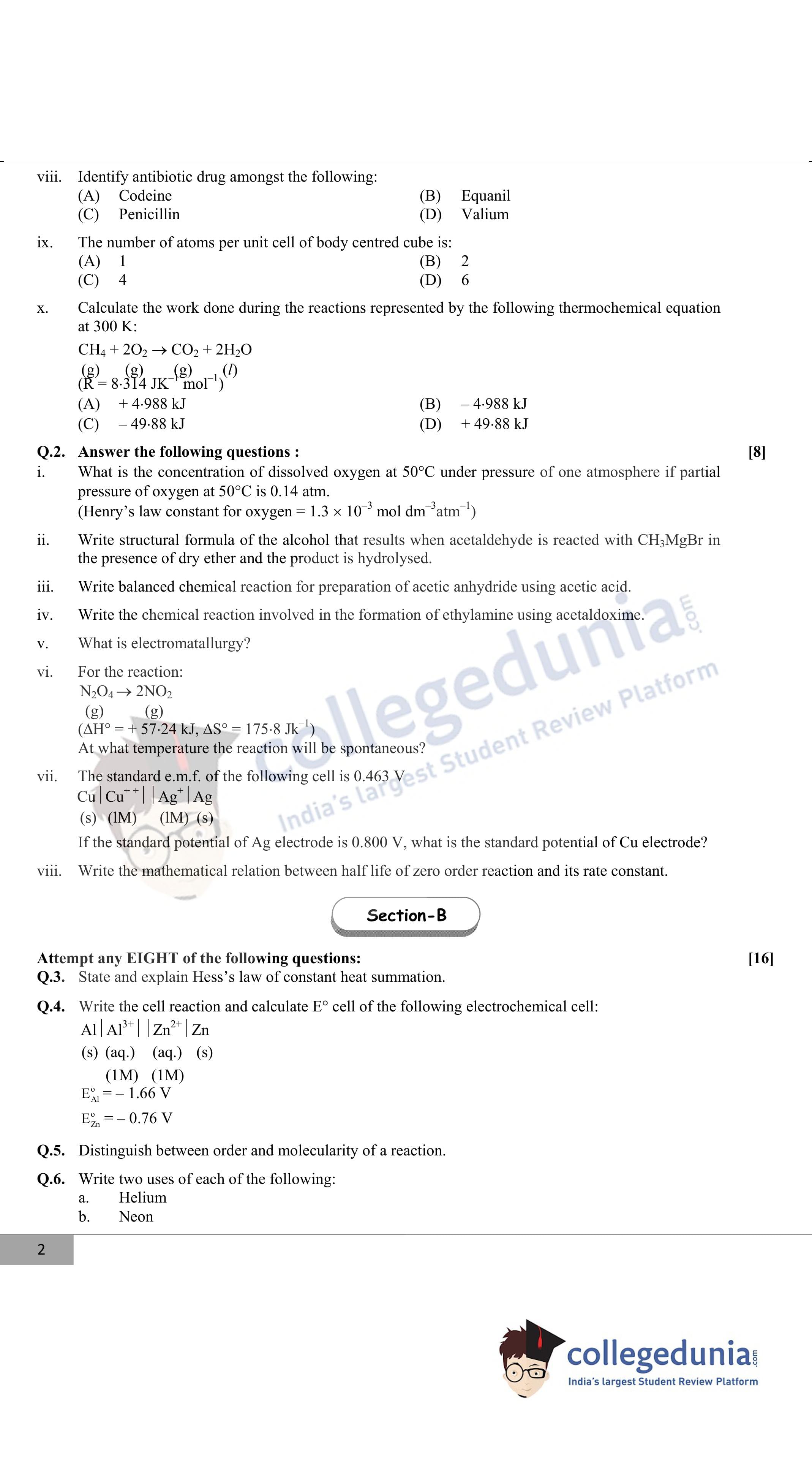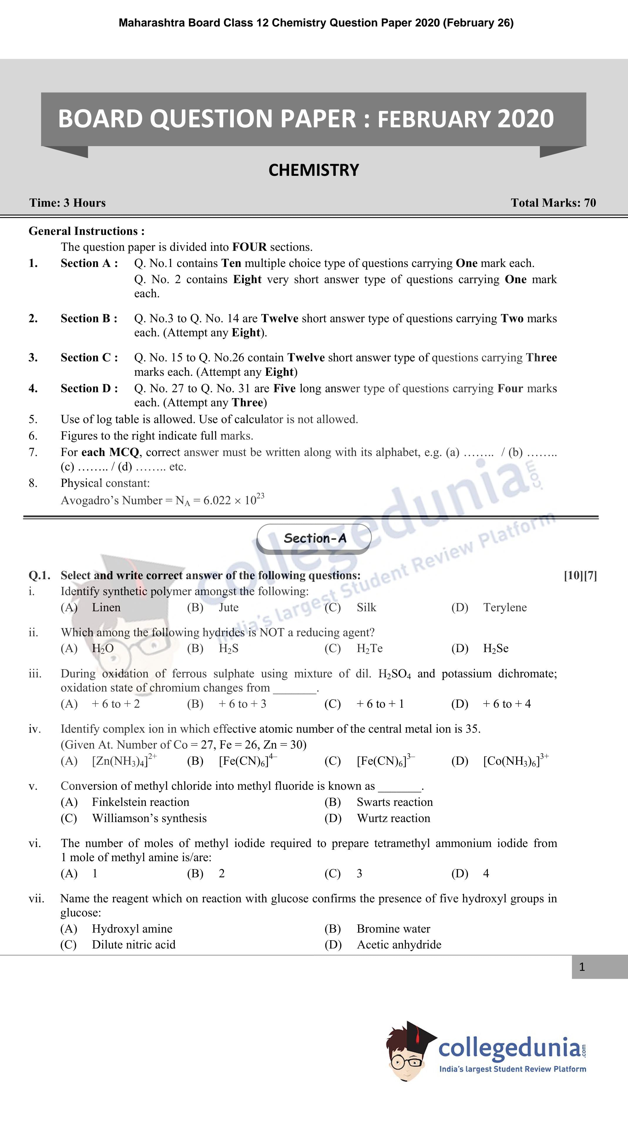 Maharashtra Board Class 12 Chemistry Question Paper 2020 with Answer Key is available for download. The exam was conducted by the Maharashtra State Board of Secondary & Higher Secondary Education (MSBSHSE) on February 26, 2020 in the Morning Session 11.00 AM to 2.00 PM. The medium of paper was English. The question paper comprised a total of 31 questions divided among 4 sections.