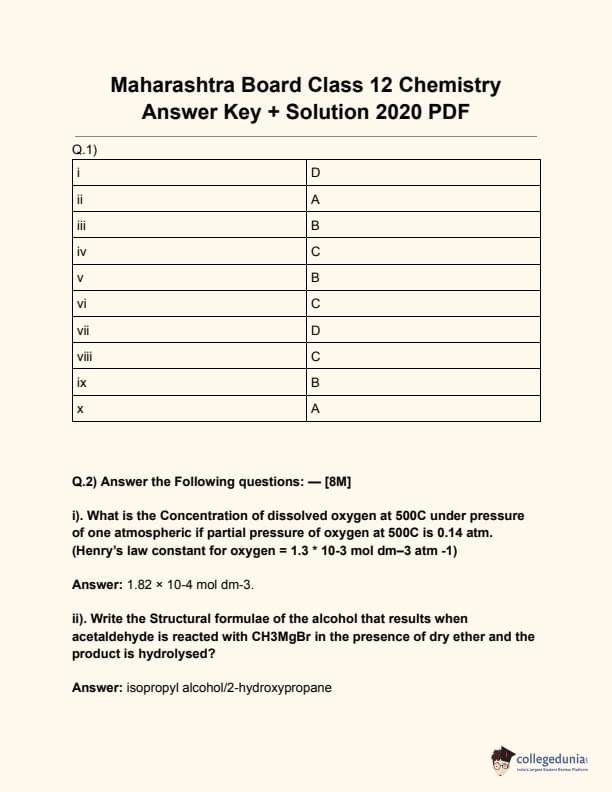 | Maharashtra Board Class 12 Chemistry Question Paper 2020 PDF | Maharashtra Board Class 12 Chemistry Answer Key + Solution 2020 PDF |