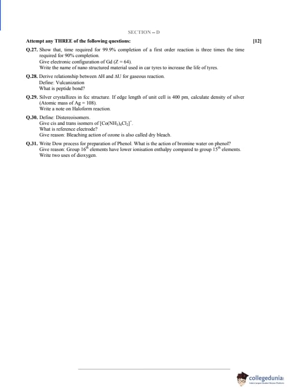 Show that, time required for 99.9 percent completion of a first order reaction is three times the time required for 90 percent completion. Give electronic configuration of Gd (Z = 64). Write the name of nano structured material used in car tyres to increase the life of tyres.