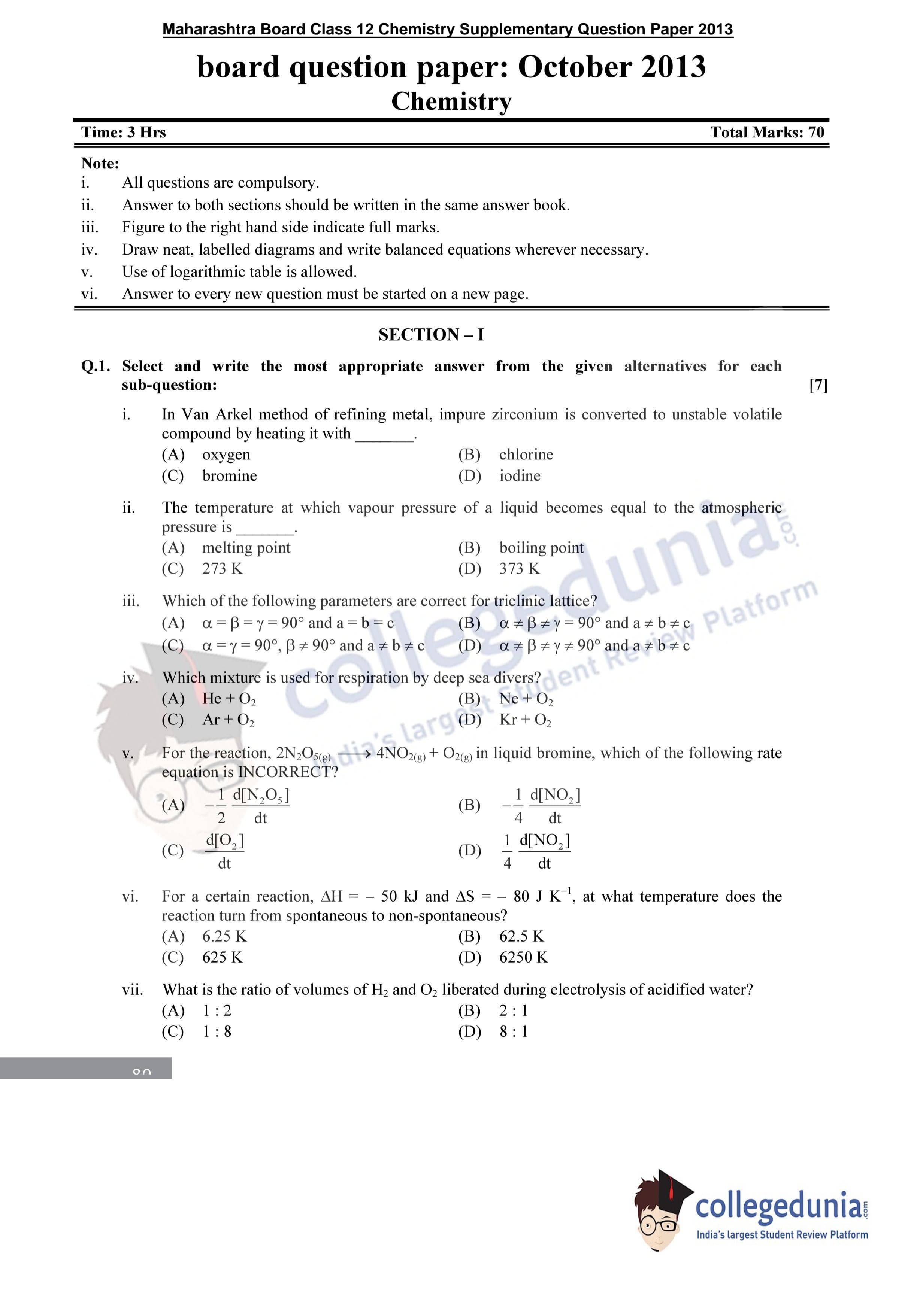 | Maharashtra Board Class 12 Chemistry Question Paper 2013 PDF | Maharashtra Board Class 12 Chemistry Answer Key 2013 PDF |