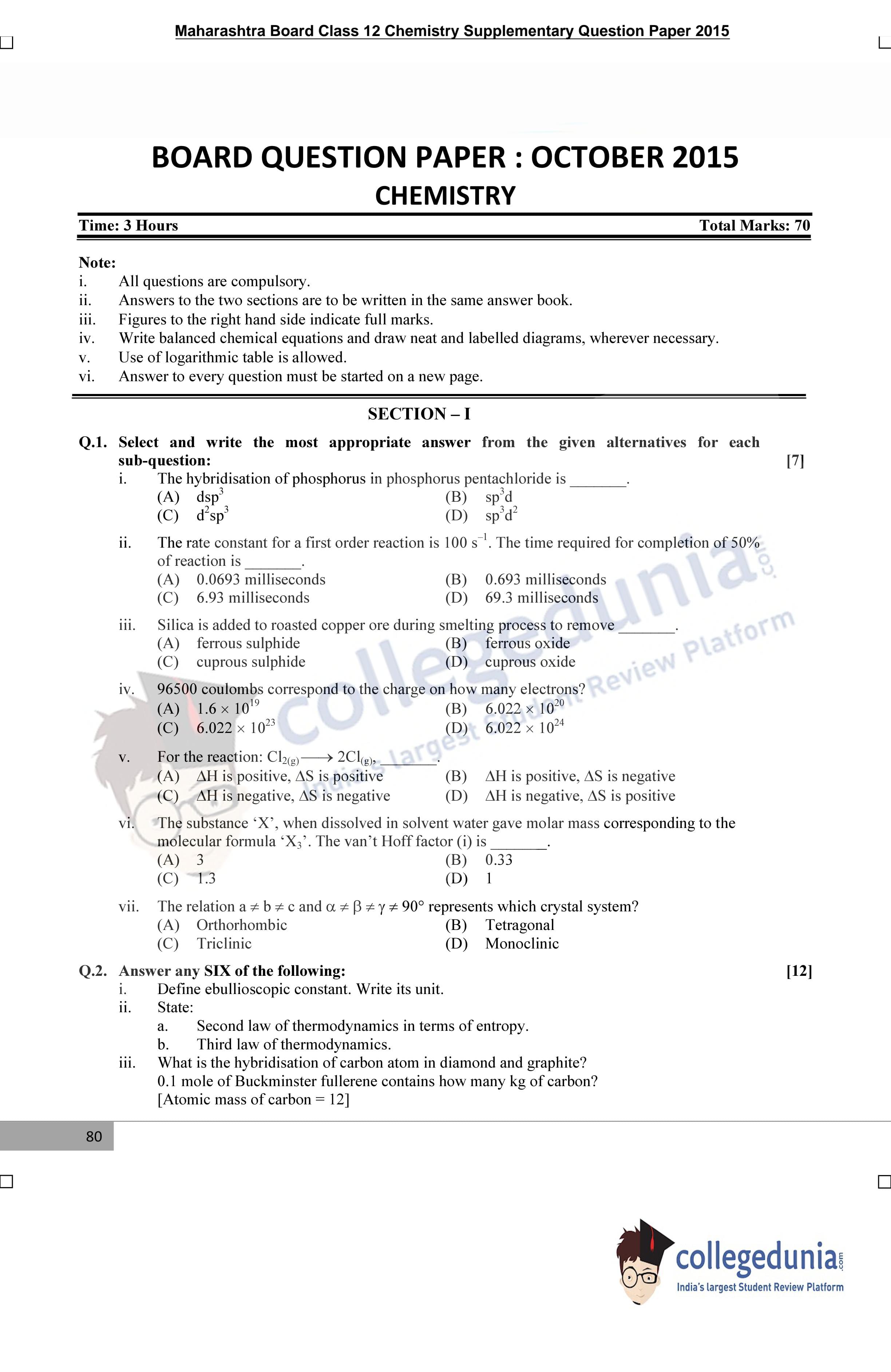 | Maharashtra Board Class 12 Chemistry Question Paper 2015 PDF | Maharashtra Board Class 12 Chemistry Answer Key 2015 PDF |
