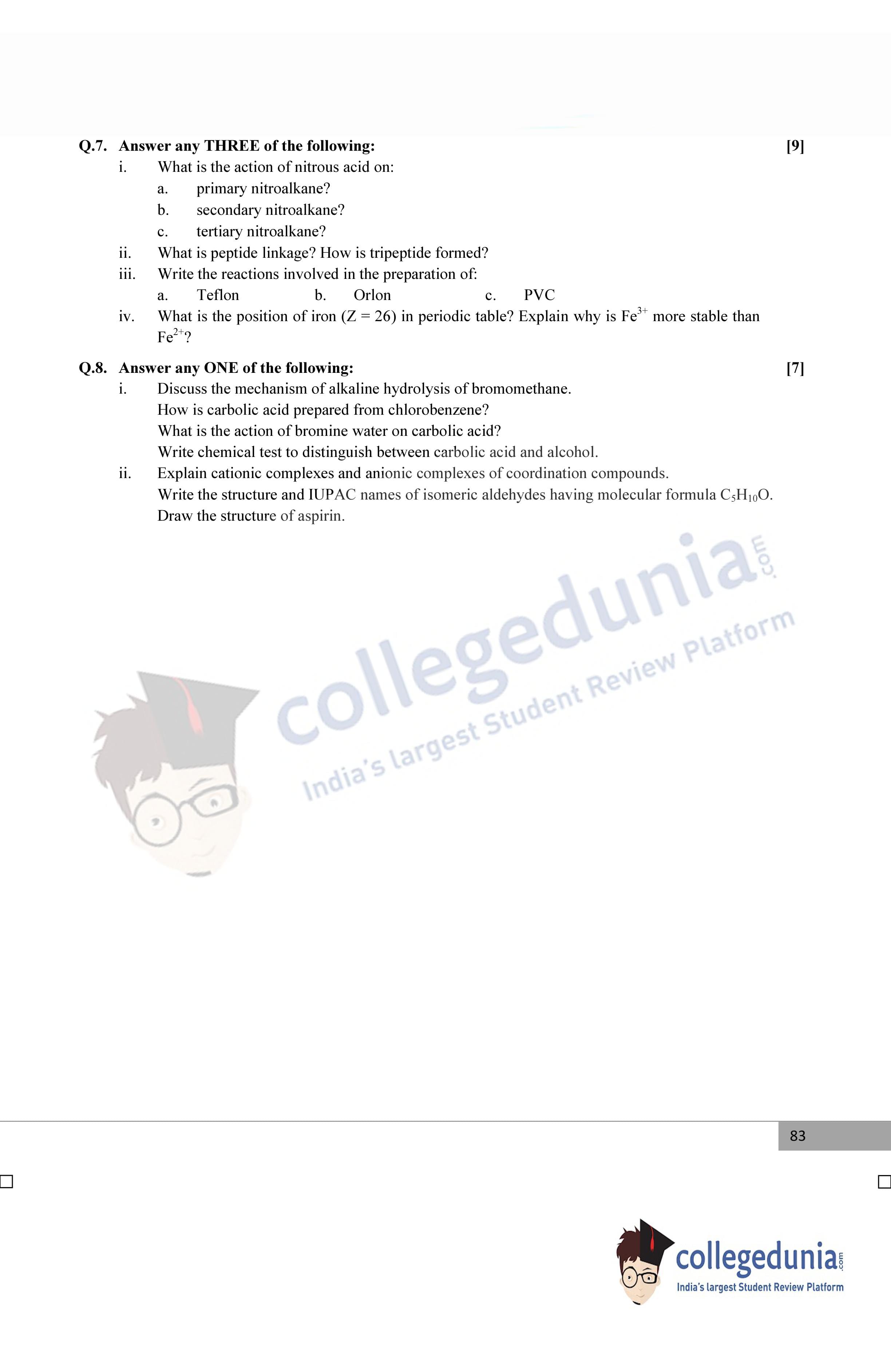 Maharashtra Board Class 12 Chemistry Supplementary Question Paper 2015 with Answer Key
