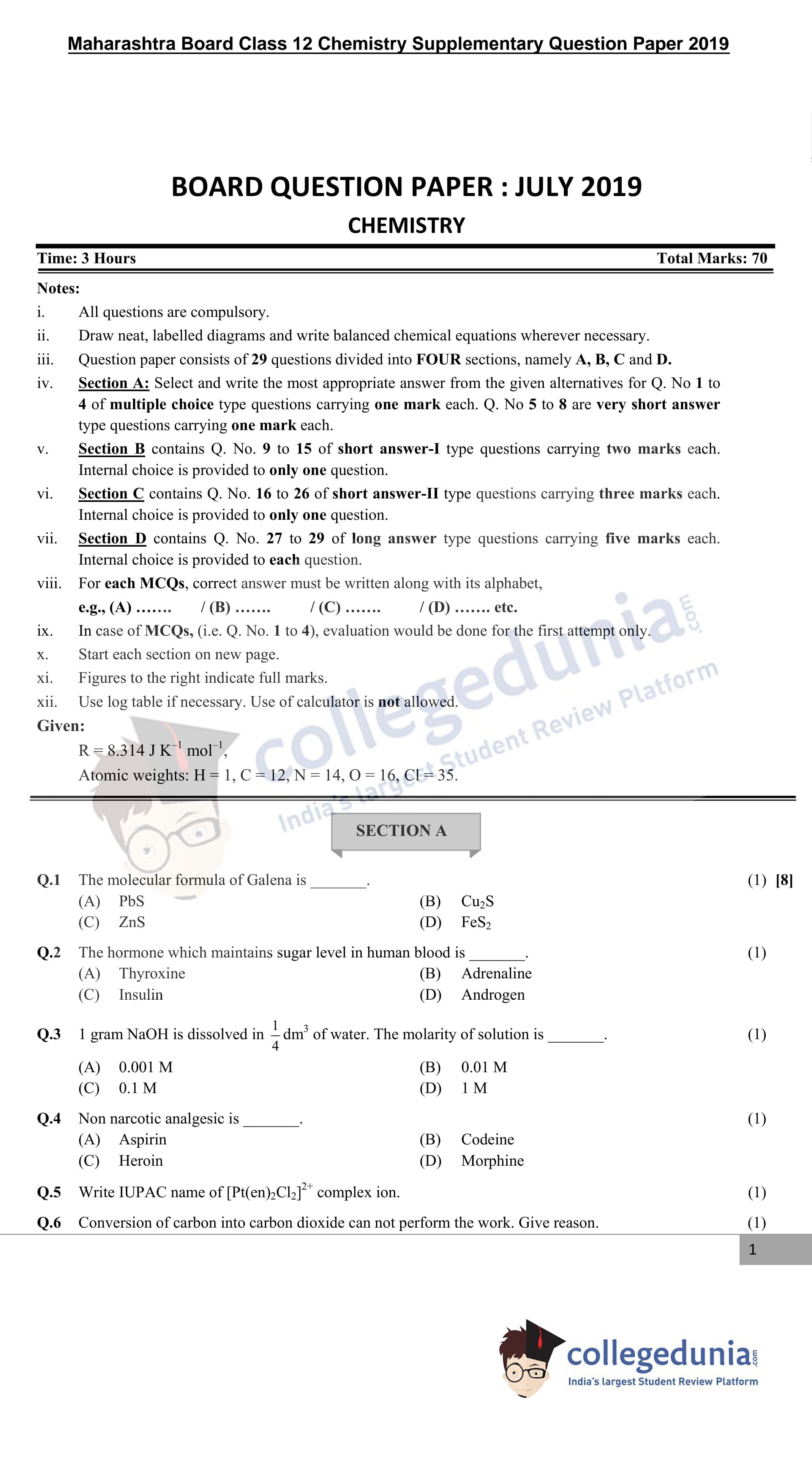 | Maharashtra Board Class 12 Chemistry Question Paper 2019 PDF | Maharashtra Board Class 12 Chemistry Answer Key 2019 PDF |