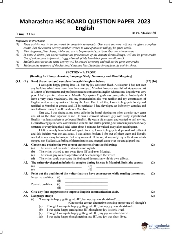 | Maharashtra Board Class 12 English Question Paper 2023 with Answer Key | Check Solution |
