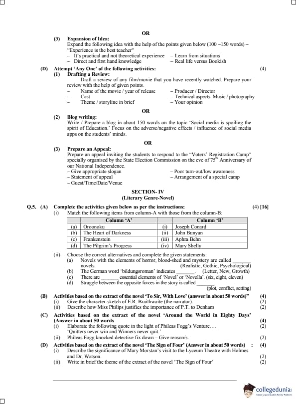 (ii) The theme of the extract from ‘The Sign of Four’ revolves around mystery, adventure, and justice. It explores the quest for truth behind Mary Morstan’s inheritance and her father’s disappearance, with Holmes’ deductive skills uncovering secrets tied to greed and betrayal. (Word count: 45) Quick Tip: For matching literary works, recall authors and their famous works. For novel-related questions, understand key terms like ‘Gothic’ or ‘bildungsroman.’ When answering extract-based questions, provide concise responses (within 50 words) by focusing on key character traits, events, or themes directly supported by the text.