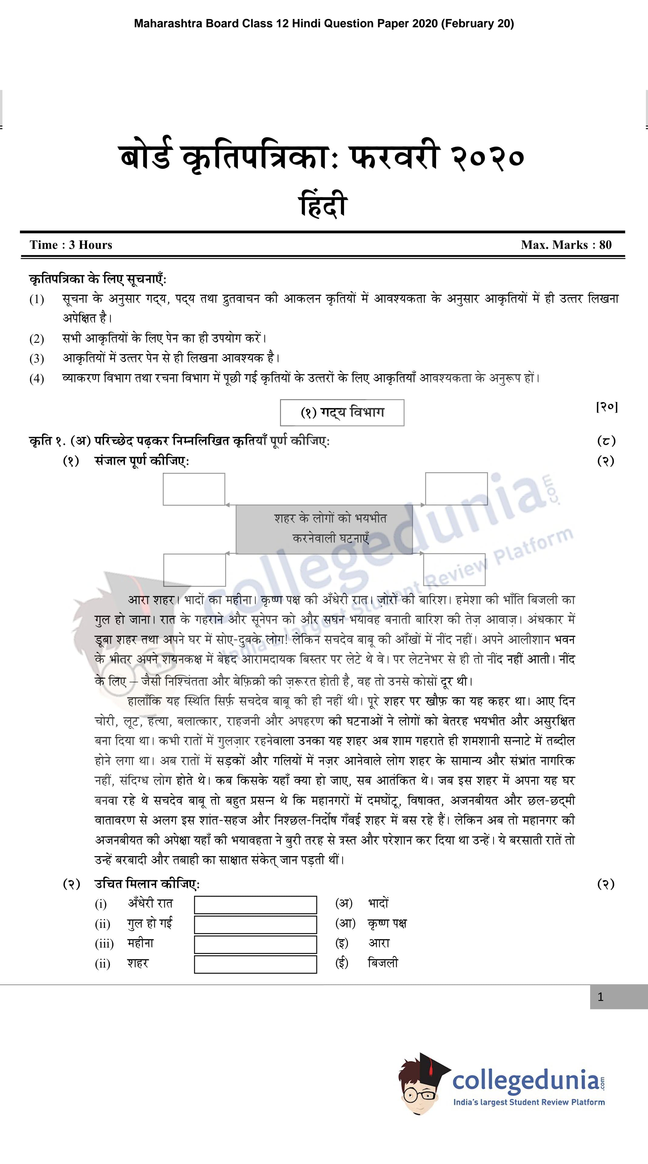 Maharashtra Board Class 12 Hindi Question Paper 2020 with Answer Key (February 20)