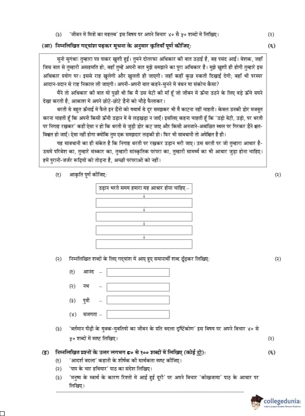 मित्र जीवन को सार्थक बनाते हैं। वे सुख-दुख में साथ देते, प्रेरणा प्रदान करते और सही मार्ग दिखाते हैं। मित्रों का सहयोग आत्मविश्वास बढ़ाता है और चुनौतियों का सामना करने की शक्ति देता है। सच्चे मित्र निस्वार्थ भाव से जीवन को समृद्ध करते हैं। (४२ शब्द) Quick Tip: गद्यांश आधारित प्रश्नों में संदर्भ से सटीक जानकारी निकालें और व्यक्तिगत विचार संक्षिप्त, स्पष्ट रखें।