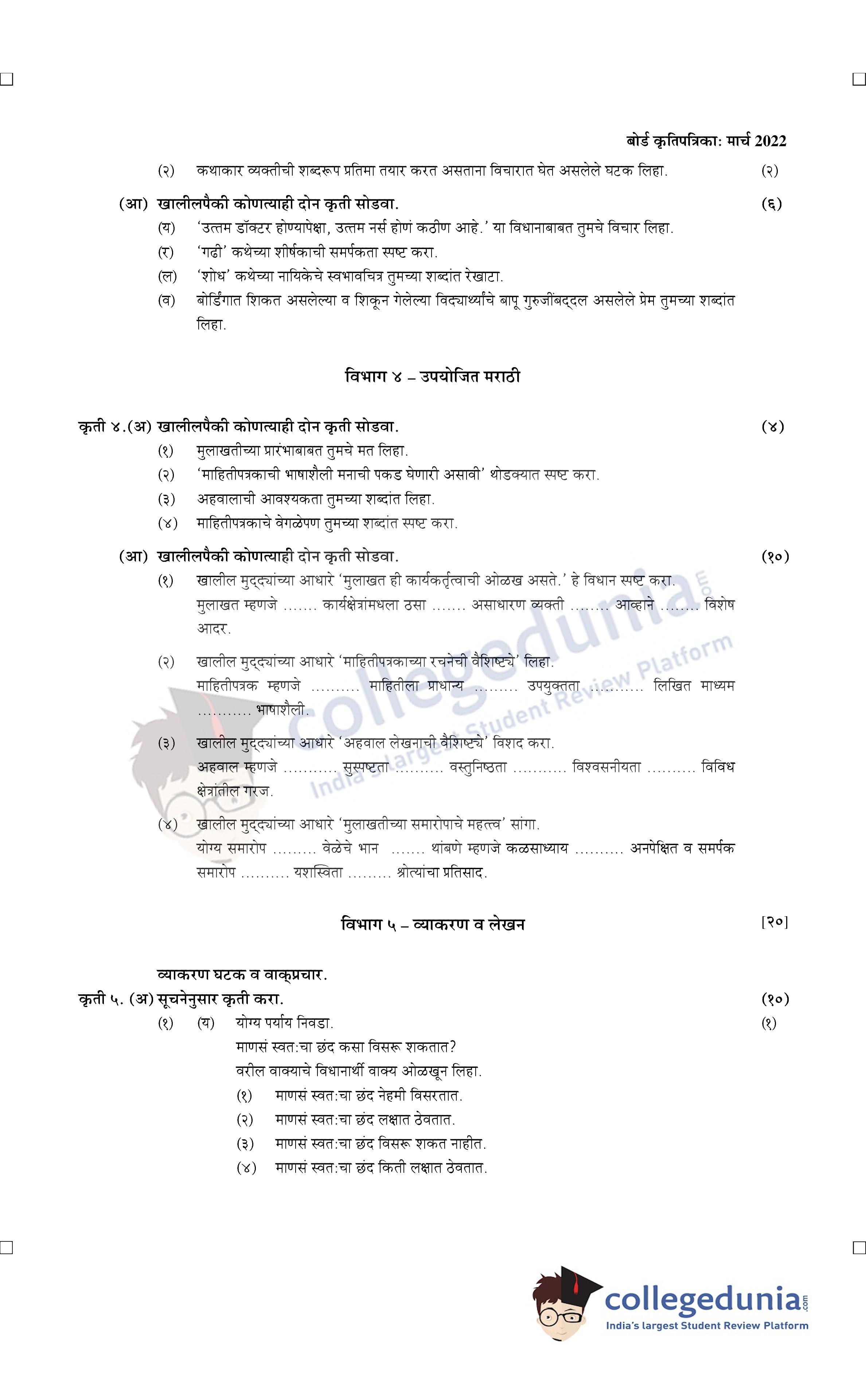Maharashtra Board Class 12 Marathi Question Paper 2022 with Answer Key is available for download. The exam was conducted by the Maharashtra State Board of Secondary & Higher Secondary Education (MSBSHSE) on April 7, 2022 in the Morning Session 10:30 AM to 2 PM. The medium of paper was Marathi. In terms of difficulty level, Maharashtra Board Class 12 Marathi paper was of Easy level. The question paper comprised a total of 5 questions divided among 5 sections.