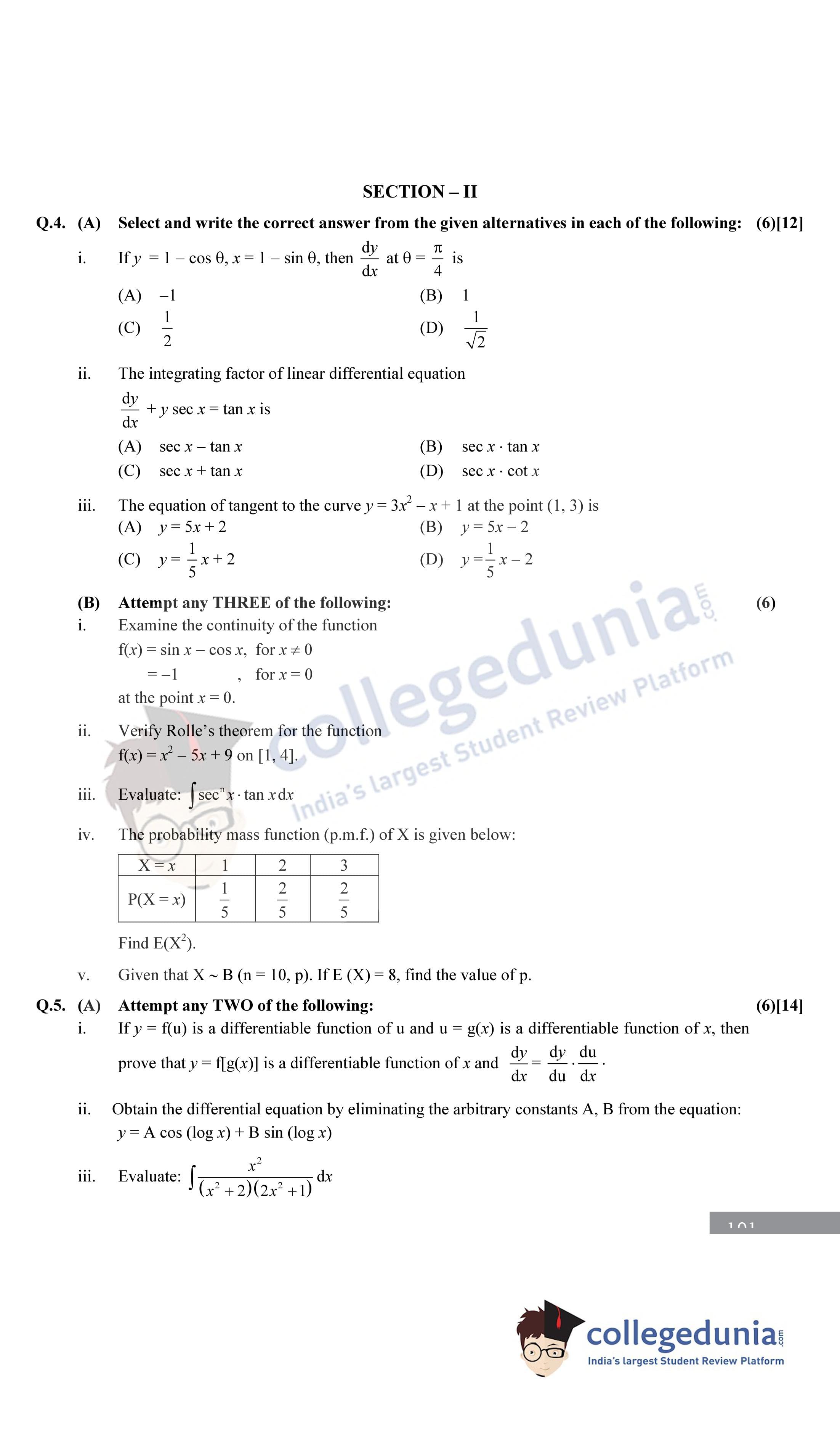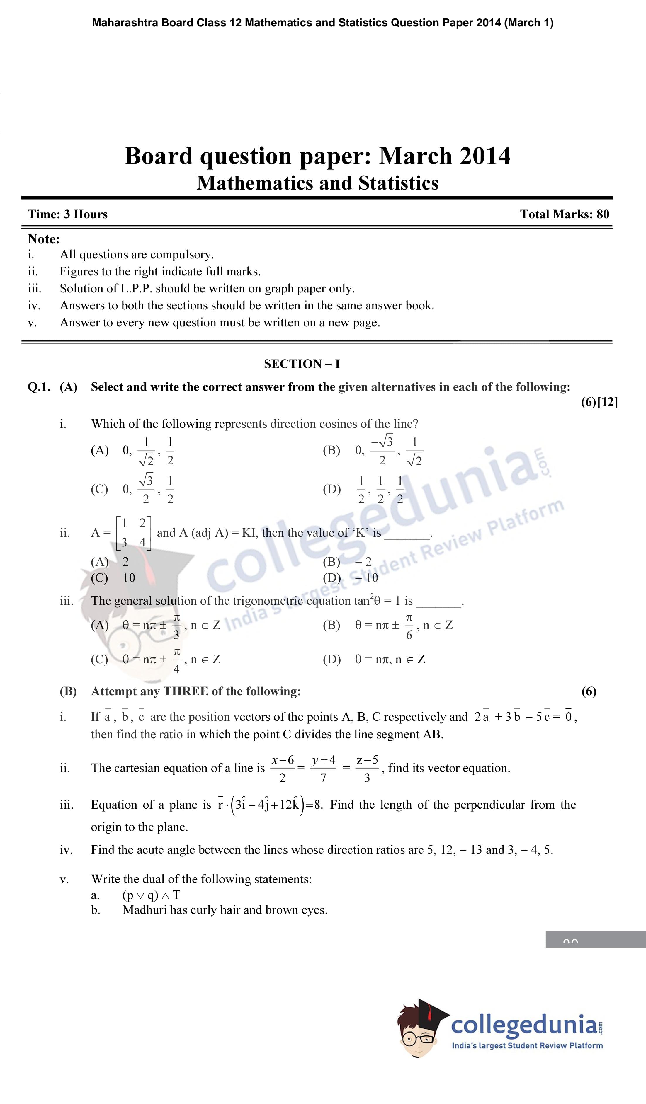 Maharashtra Board Class 12 Mathematics and Statistics Question Paper 2014 with Answer Key is available for download. The exam was conducted by the Maharashtra State Board of Secondary & Higher Secondary Education (MSBSHSE) on March 1, 2014 in the Morning Session 11.00 AM to 2.00 PM. The medium of paper was English. The question paper comprised a total of 6 questions divided among 2 sections.