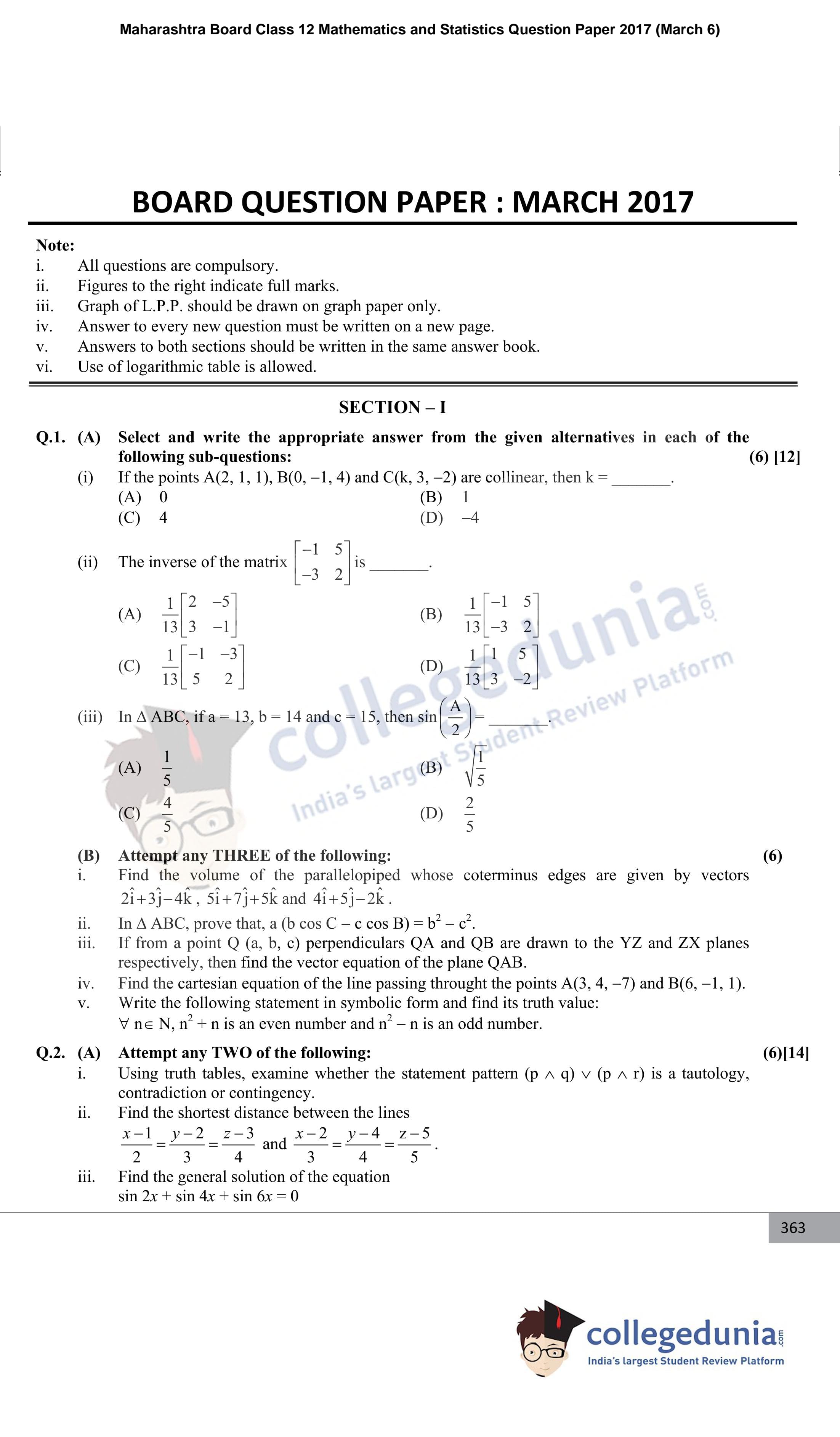 Maharashtra Board Class 12 Mathematics and Statistics Question Paper 2017 with Answer Key (March 6)