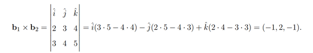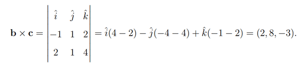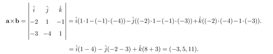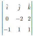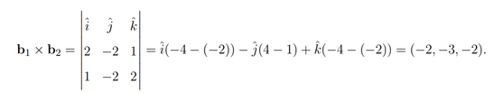 \[= \hat{i}((-2) \cdot 1 - 2 \cdot 1) - \hat{j}(0 \cdot 1 - 2 \cdot (-1)) + \hat{k}(0 \cdot 1 - (-2) \cdot (-1)) = (-4, -2, -2). \]