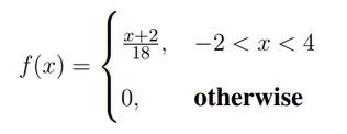 Verify \( f(x) \) is a valid PDF: \[ \int_{-2}^4 \frac{x + 2}{18} \, dx = \frac{1}{18} \left[ \frac{x^2}{2} + 2x \right]_{-2}^4 = \frac{1}{18} \left( \left( \frac{16}{2} + 8 \right) - \left( \frac{4}{2} - 4 \right) \right) = \frac{1}{18} (16 - (-2)) = 1. \]