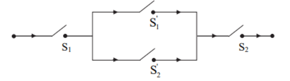 The problem references \( S_1, S_2, \neg S_1, \neg S_2 \), suggesting a logic circuit with inputs \( S_1, S_2 \) and their negations. Without a specific circuit diagram, assume a common configuration, e.g., an expression involving AND, OR, or XOR gates. A typical circuit might be \( (\neg S_1 \land S_2) \lor (S_1 \land \neg S_2) \), which simplifies to XOR.