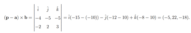 or use: \[ d = \frac{|(\mathbf{p} - \mathbf{a}) \times \mathbf{b}|}{|\mathbf{b}|}. \] \[ \mathbf{p} - \mathbf{a} = (3-7, 2-7, 1-6) = (-4, -5, -5). \]