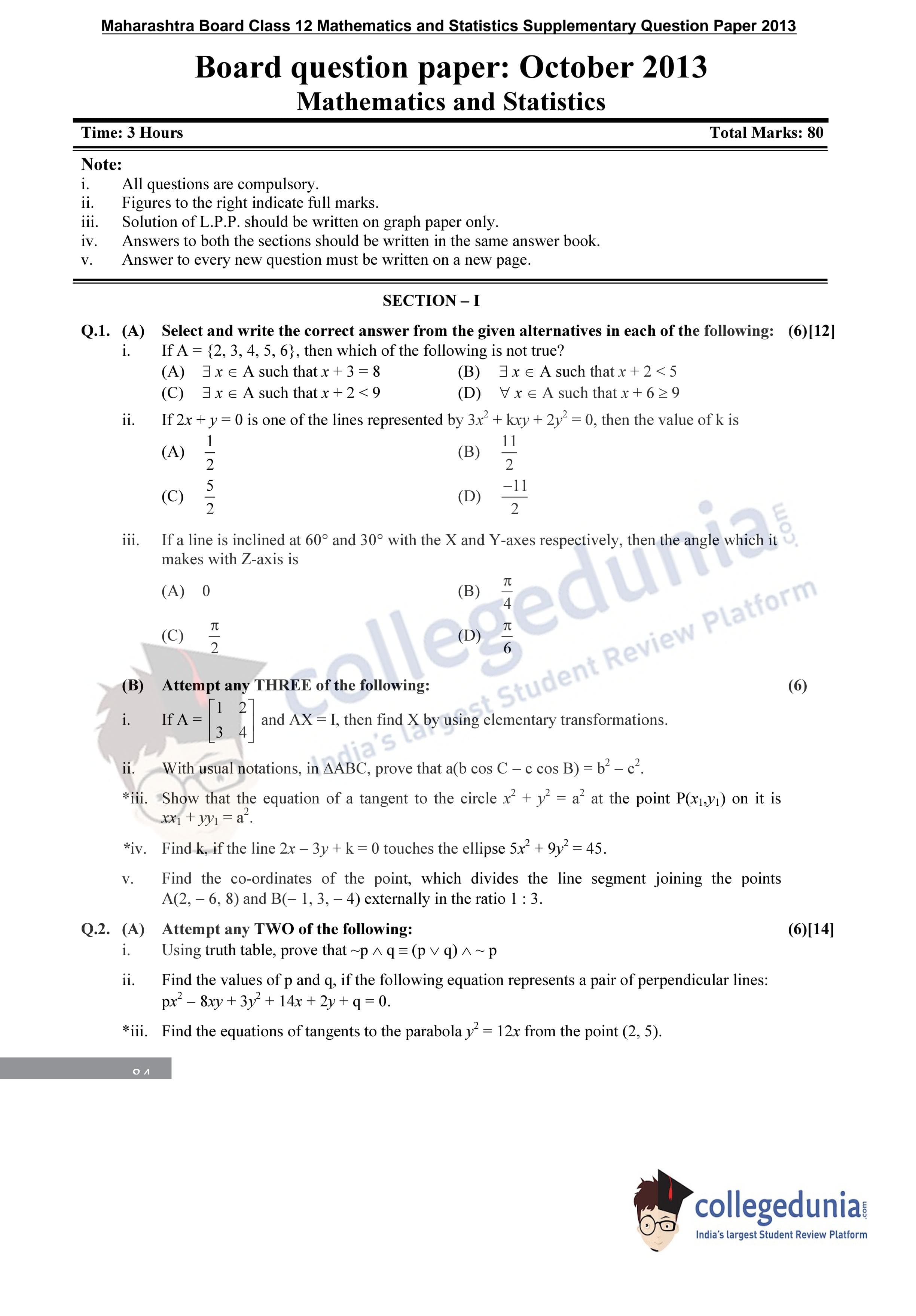Maharashtra Board Class 12 Mathematics and Statistics Supplementary Question Paper 2013 with Answer Key is available for download. The exam was conducted by the Maharashtra State Board of Secondary & Higher Secondary Education (MSBSHSE). The medium of paper was English. The question paper comprised a total of 6 questions divided among 2 sections.