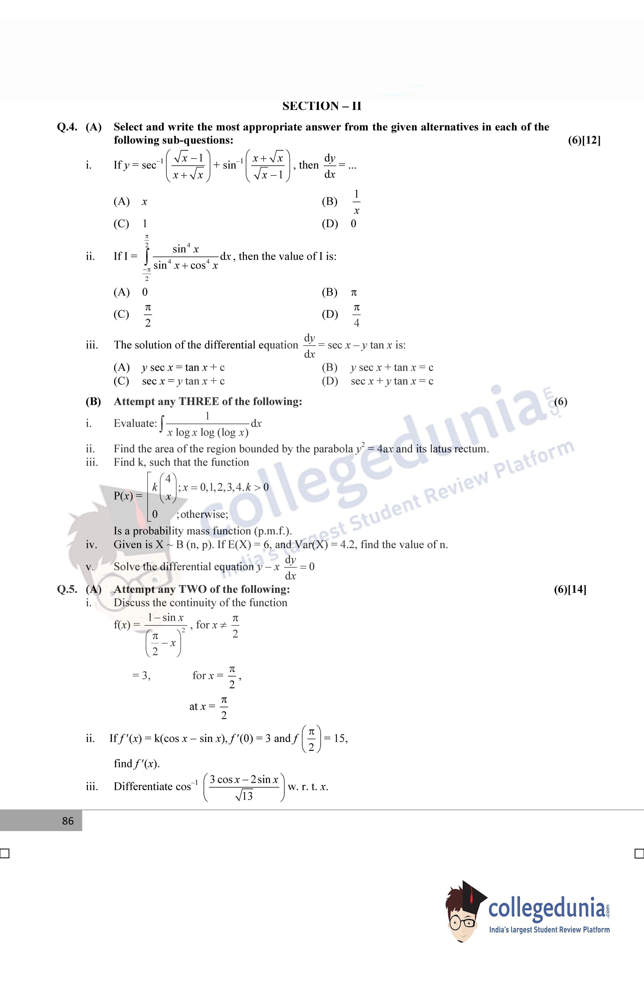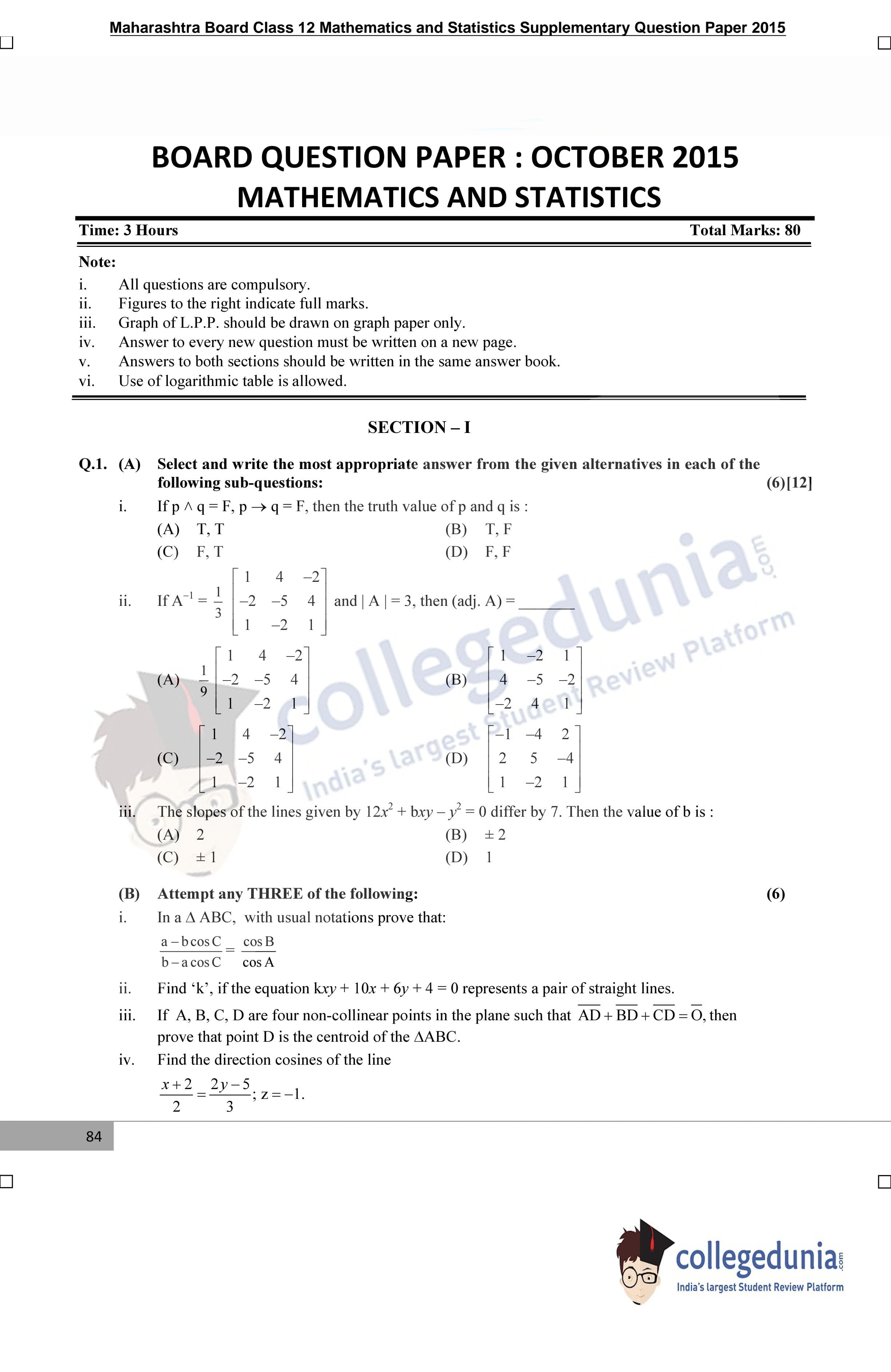 Maharashtra Board Class 12 Mathematics and Statistics Supplementary Question Paper 2015 with Answer Key is available for download. The exam was conducted by the Maharashtra State Board of Secondary & Higher Secondary Education (MSBSHSE). The medium of paper was English. The question paper comprised a total of 6 questions divided among 2 sections.