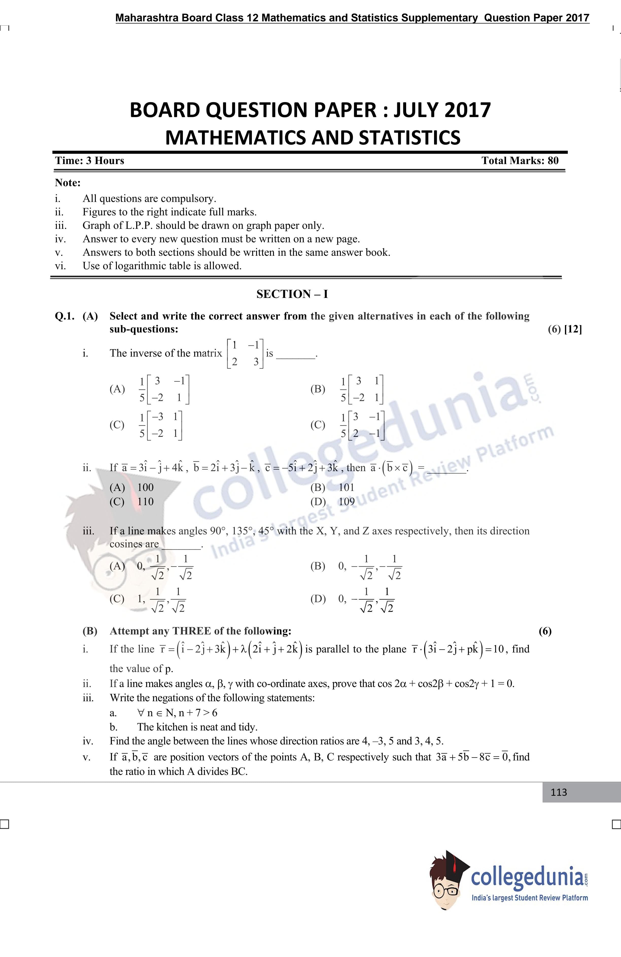 Maharashtra Board Class 12 Mathematics and Statistics Supplementary Question Paper 2017 with Answer Key is available for download. The exam was conducted by the Maharashtra State Board of Secondary & Higher Secondary Education (MSBSHSE). The medium of paper was English. The question paper comprised a total of 6 questions divided among 2 sections.
