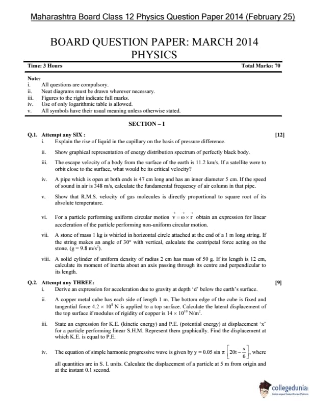 Maharashtra Board Class 12 Physics Question Paper 2014 with Answer Key (February 25)