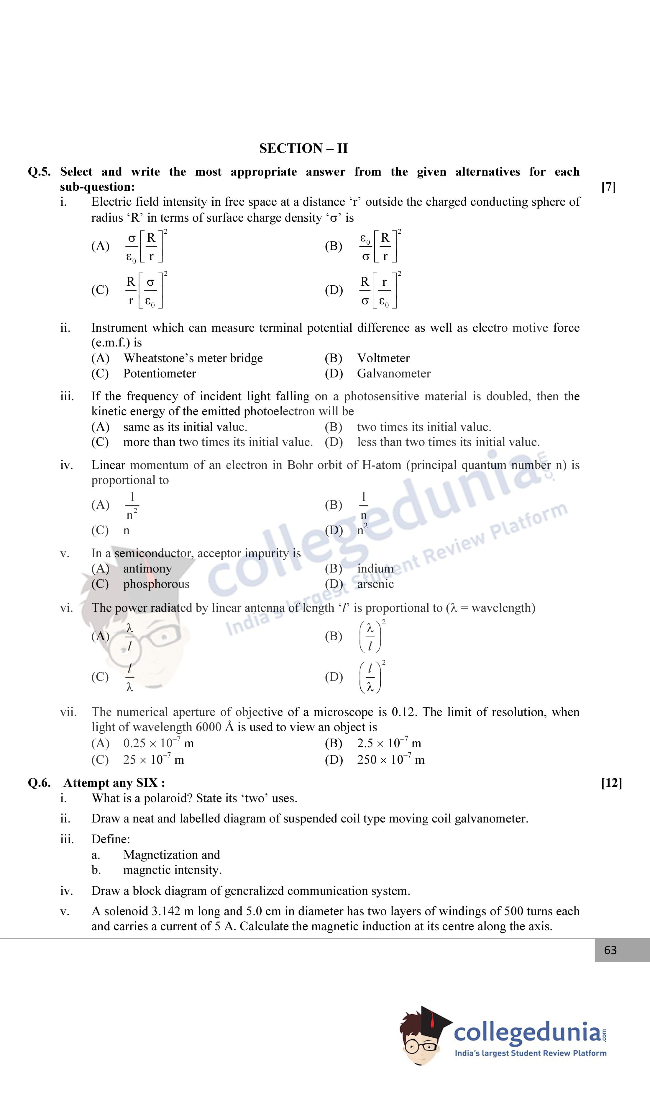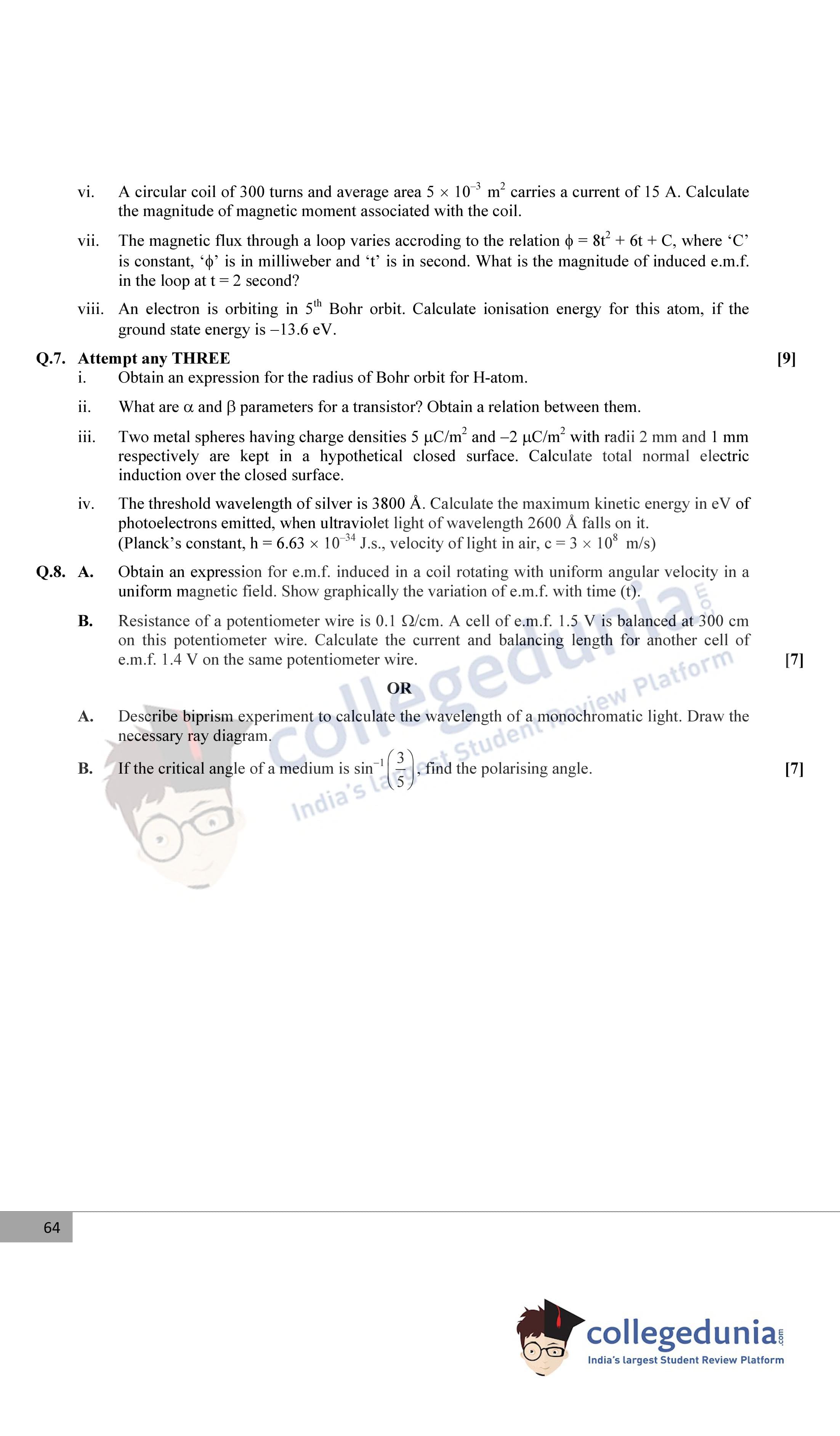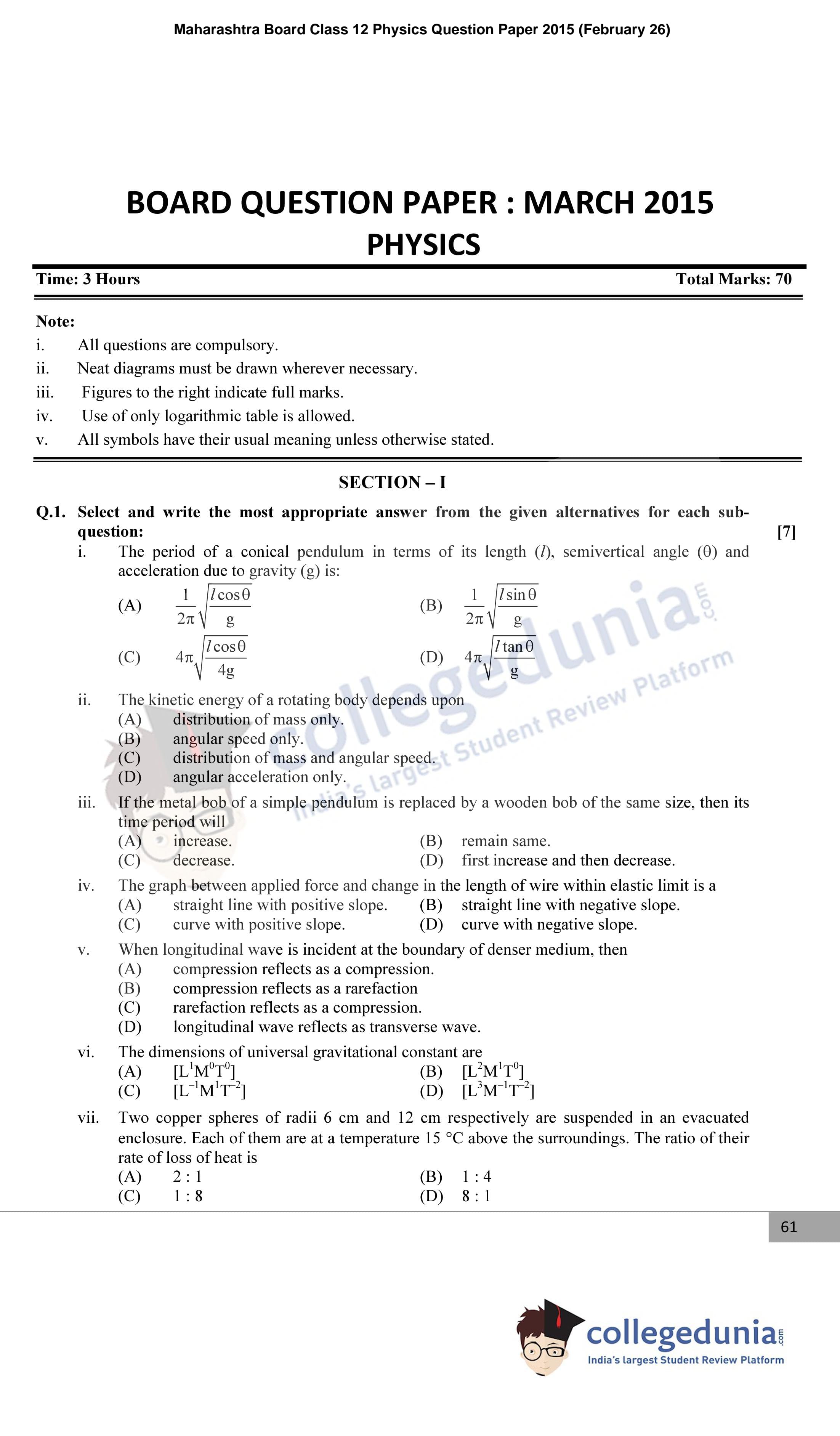 Maharashtra Board Class 12 Physics Question Paper 2015 with Answer Key is available for download. The exam was conducted by the Maharashtra State Board of Secondary & Higher Secondary Education (MSBSHSE) on February 26, 2015 in the Morning Session 11.00 AM to 2.00 PM. The medium of paper was English. The question paper comprised a total of 8 questions divided among 2 sections.