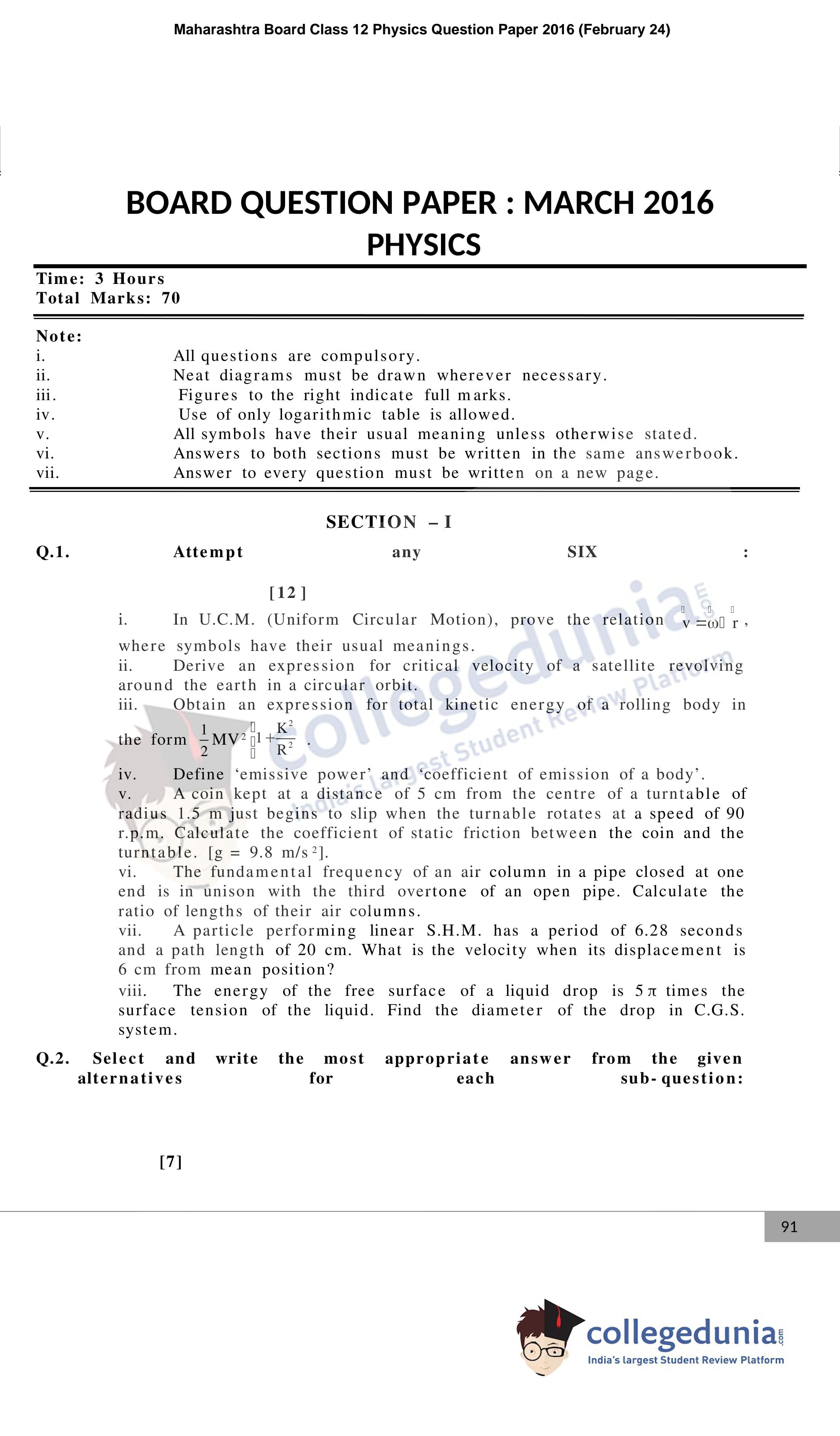 Maharashtra Board Class 12 Physics Question Paper 2016 with Answer Key (February 24)